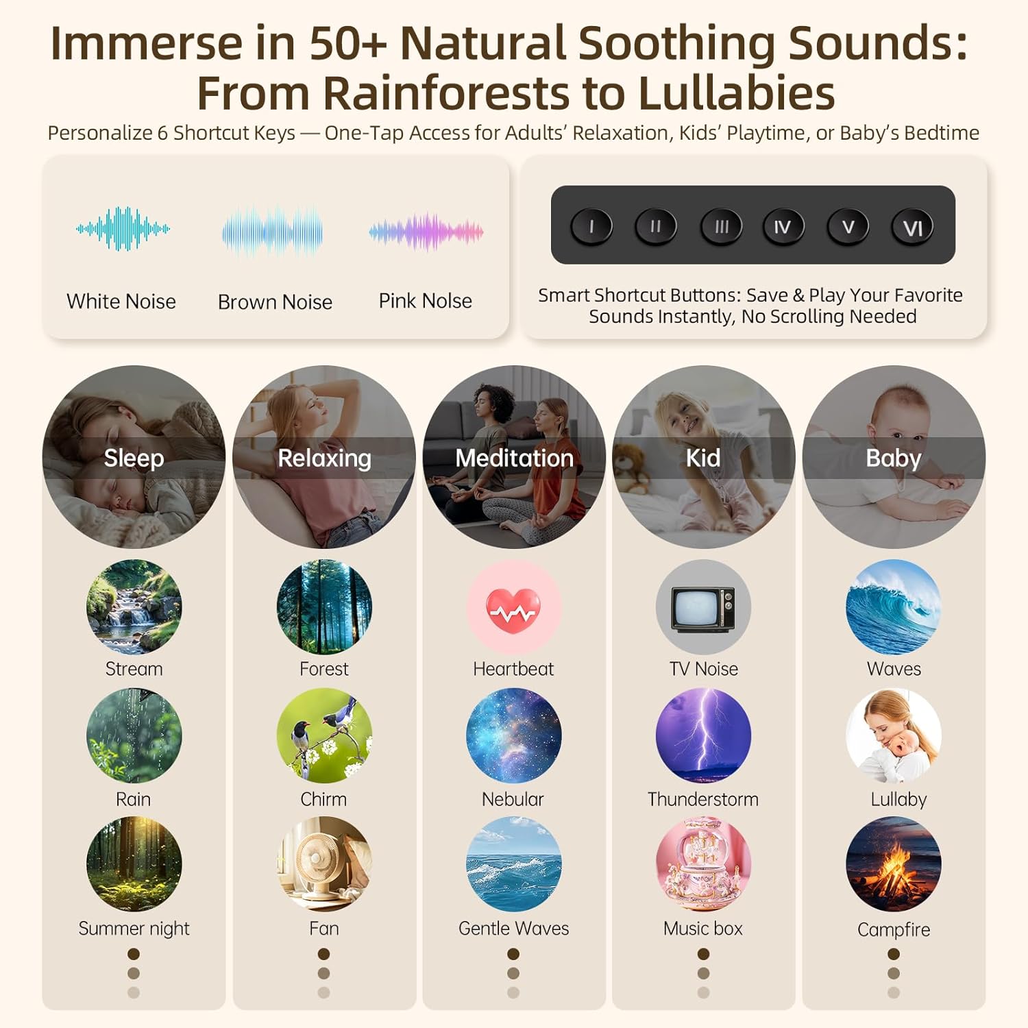 - 【Applicable to All Ages People】For Adults, Kids, and Babies, Whether soothing a baby to sleep, helping a toddler relax, or creating a peaceful atmosphere for adults, this white noise sound machine is perfect for the whole family. Provides sleep and relaxation support, ideal for improving sleep quality and focus at any age.