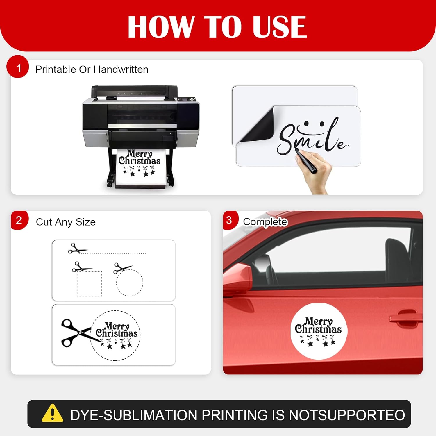 - 【CUSTOMIZATION】Blank car magnets is matte-white on the front and matte-black on the back. White car magnetic sheet are made of inkjet printable vinyl sheets and can be used with solvents, eco-friendly solvents, latex inks (or permanent markings), not compatible with sublimation printing methods. You can create a any customized logo set or personalized car magnets and decals you want.