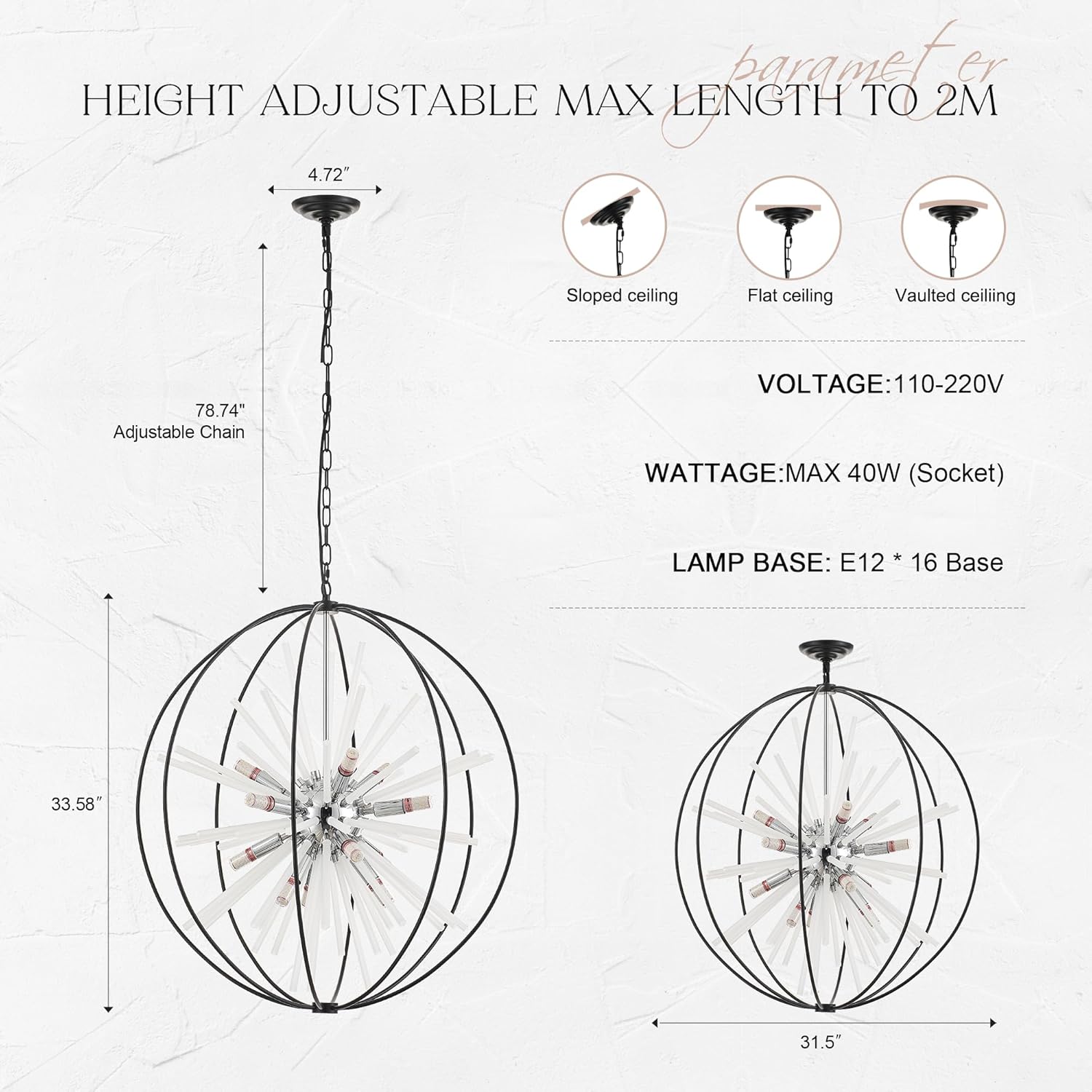 - 【Customized & Adjustable Height】This size D31.5"X H33.58", of which the length of the chain is 78.7 in(2M). Compatible with flat, sloped, and vaulted ceilings, Modern Chandelier can easily customize the height according to your preferences.