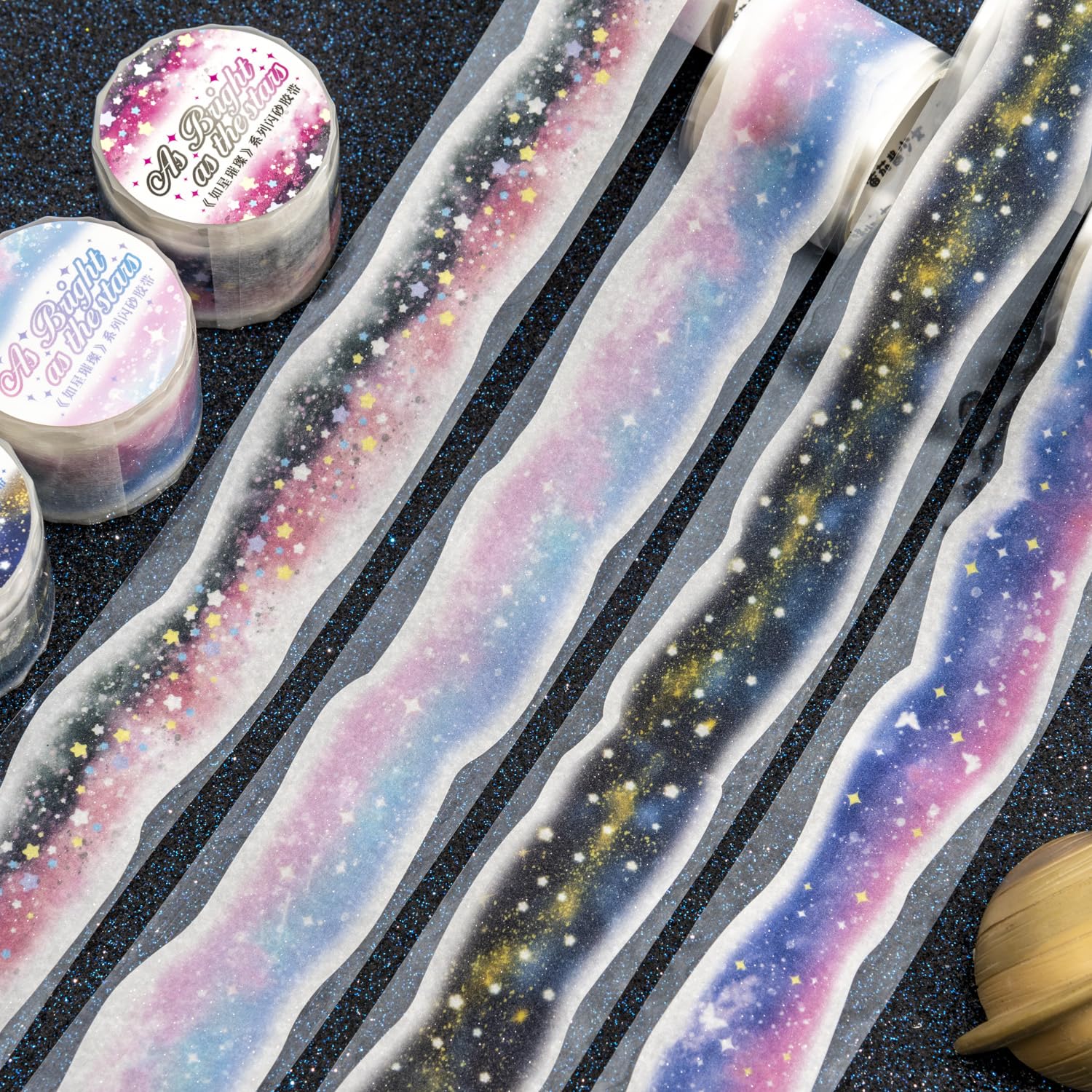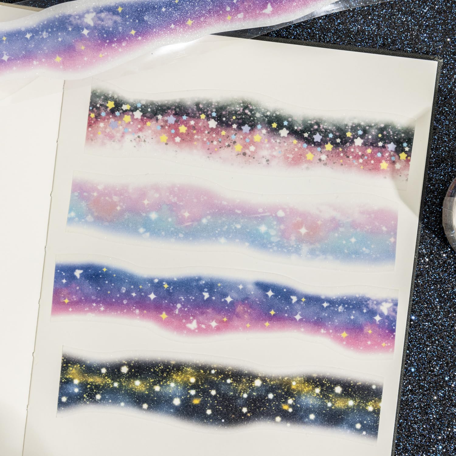 - Galaxy-Themed Glitter Design: Each roll features a unique galaxy-inspired pattern with shimmering glitter, adding a celestial and dreamy touch to your scrapbooking, journaling, and DIY projects. The design is ideal for creating cosmic-themed crafts that stand out