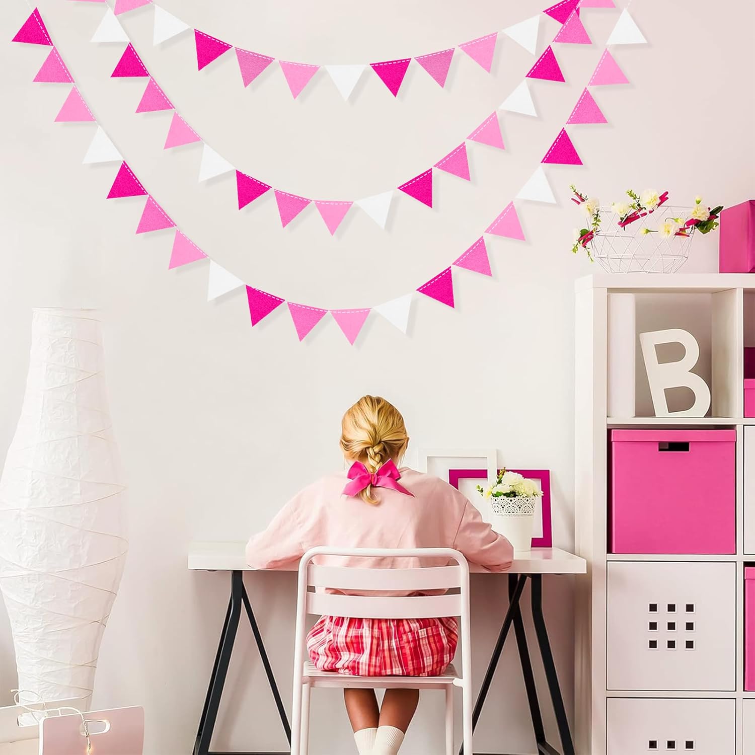 - Easy Assembly - Easy hanging and reusable.Perfect fit for gradient pink party decor.unroll and unwrap garland carefully. due to delicate nature of thread,may tangle.This hot pink mini triangle pennant makes an attractive backdrop for videos and photos.