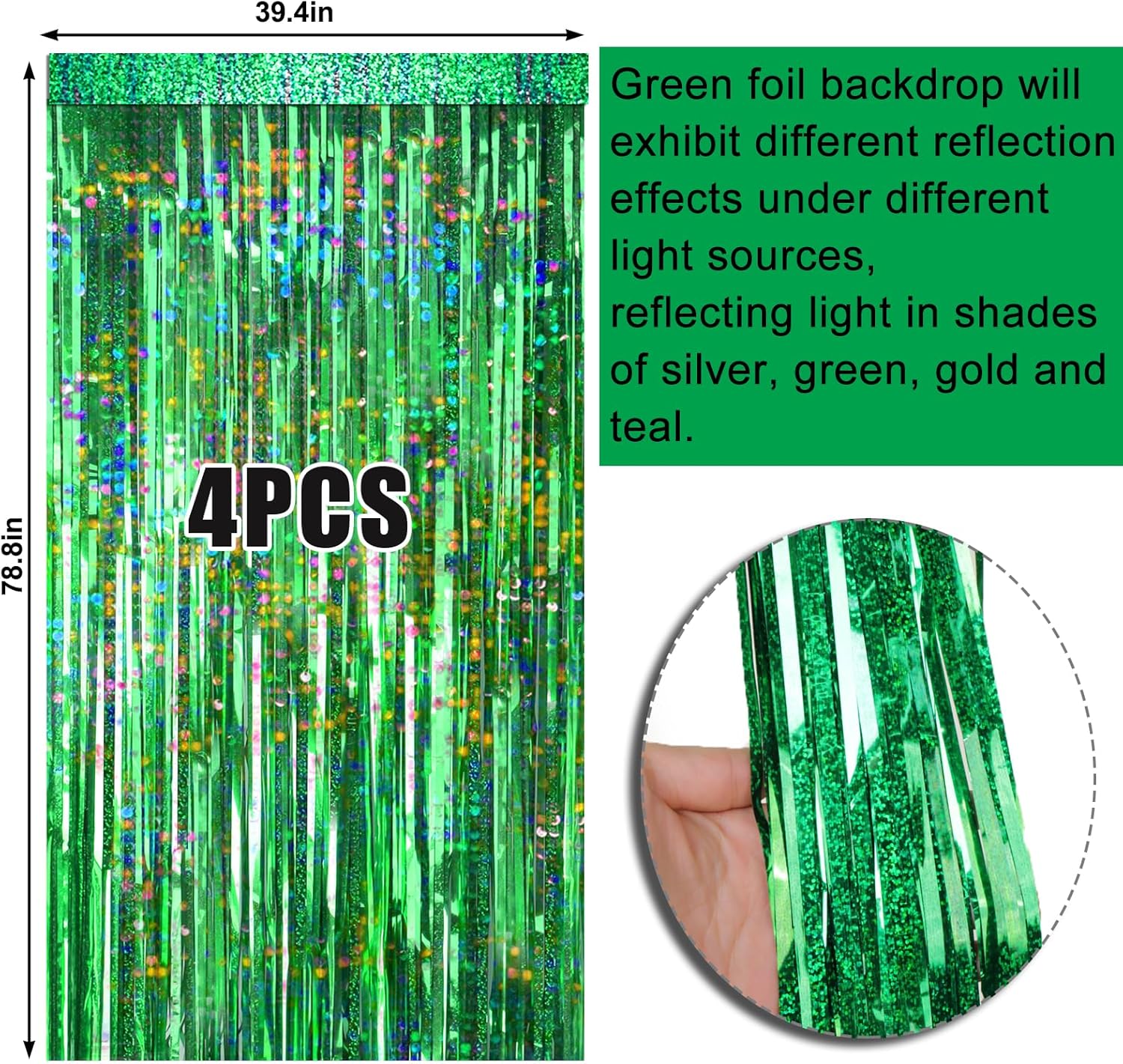 - Shimmery Green Fringe Backdrop: You will receive 4 pieces green tinsel backdrop, each pack curtains size is 3.3ft x 6.6ft, enough length for decorate your party. These foil backdrop curtains are perfect for the door or wall to create an impressive decoration for parties, events, and photo booths.