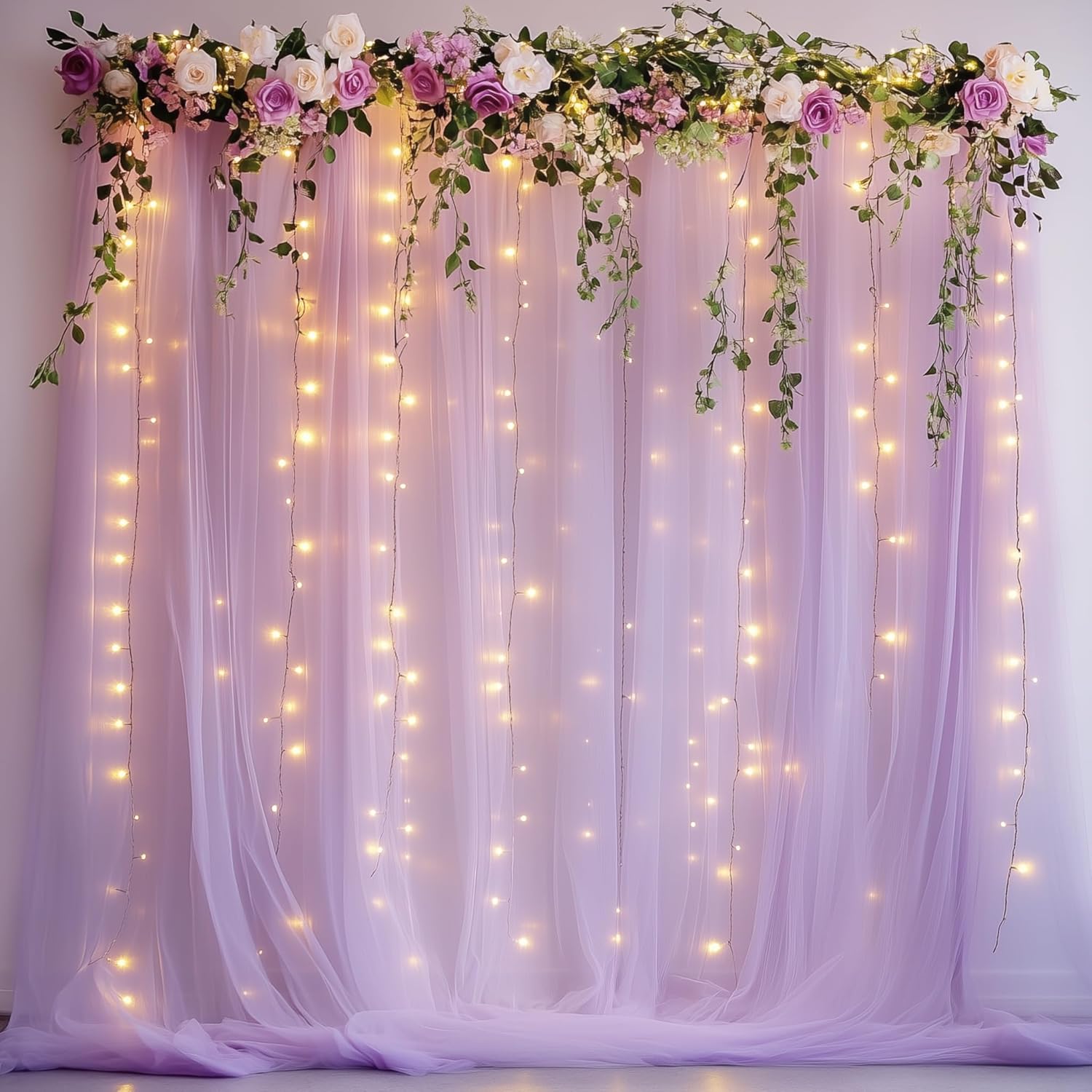 - Package Includes: The package includes 2 panels lavender sheer tulle backdrop curtains, each curtain backdrop is 5FT width and 10FT height. Also it includes a set of 10FT (10 strands) warm string light (USB Powered) and 12pcs transparent clips.