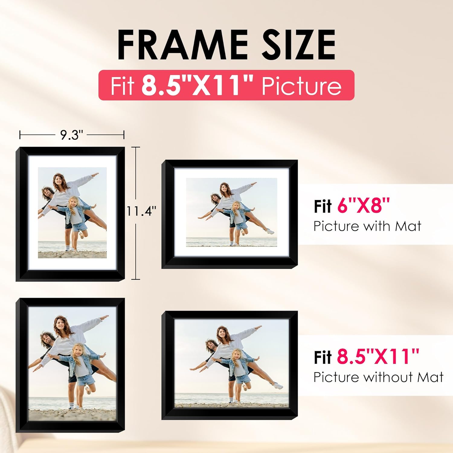 - Versatile Display: The 8.5x11 picture frames can showcase 8.5x11 photos without a mat, or with a mat, they can accommodate 6x8 photos, allowing you to layer and enhance the visual appeal of your pictures.Cherish your special memories and create a personal gallery that reflects your unique style and personality.