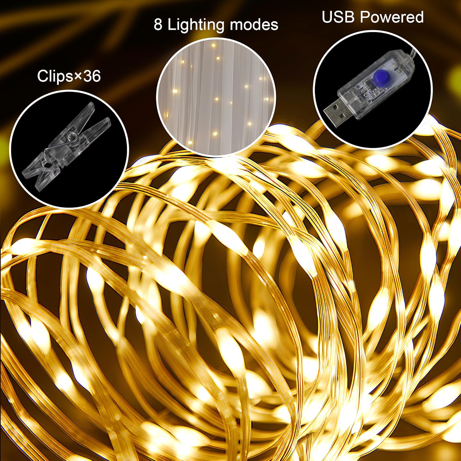 - Package Includes: The package includes 6 panels soft white curtain with lights, each panel tulle backdrop curtain size is 5FT width and 8FT height, a set of 10ft warm white string light (USB Powered) and 12pcs Transparent clips.