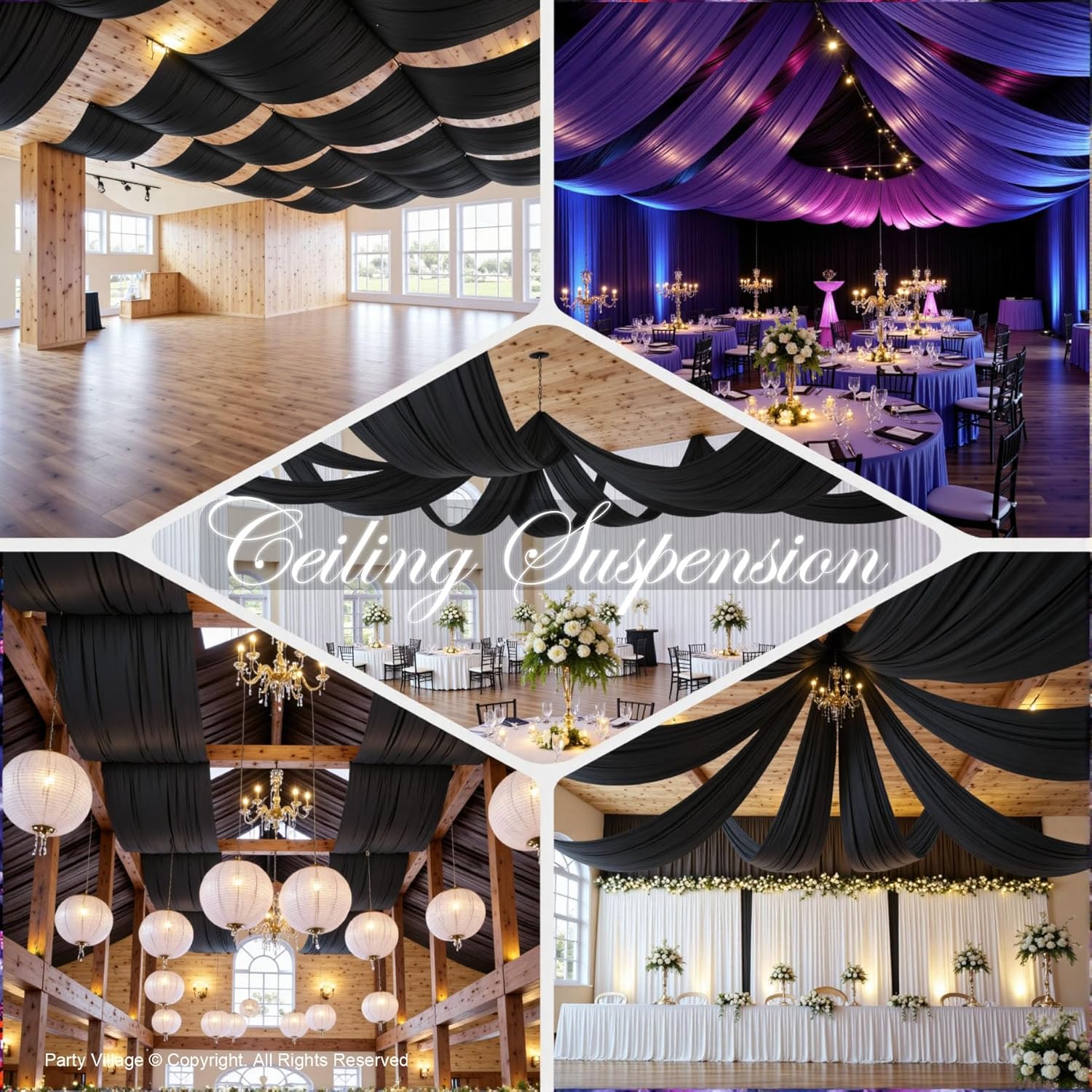- 💐【Black Ceiling Drapes】The package will include 4 panels Black wedding drape curtain(without hanging pieces), each wedding extra long curtain measures 5 feet (60inch)wide x30 feet(360inch) long.The sufficient quantity can meet your demands for decorating your weddings, parties, receptions, and these Black ceiling drapes will create a delicate and aesthetic sense to your wedding ceiling decoration and light up every banquet.