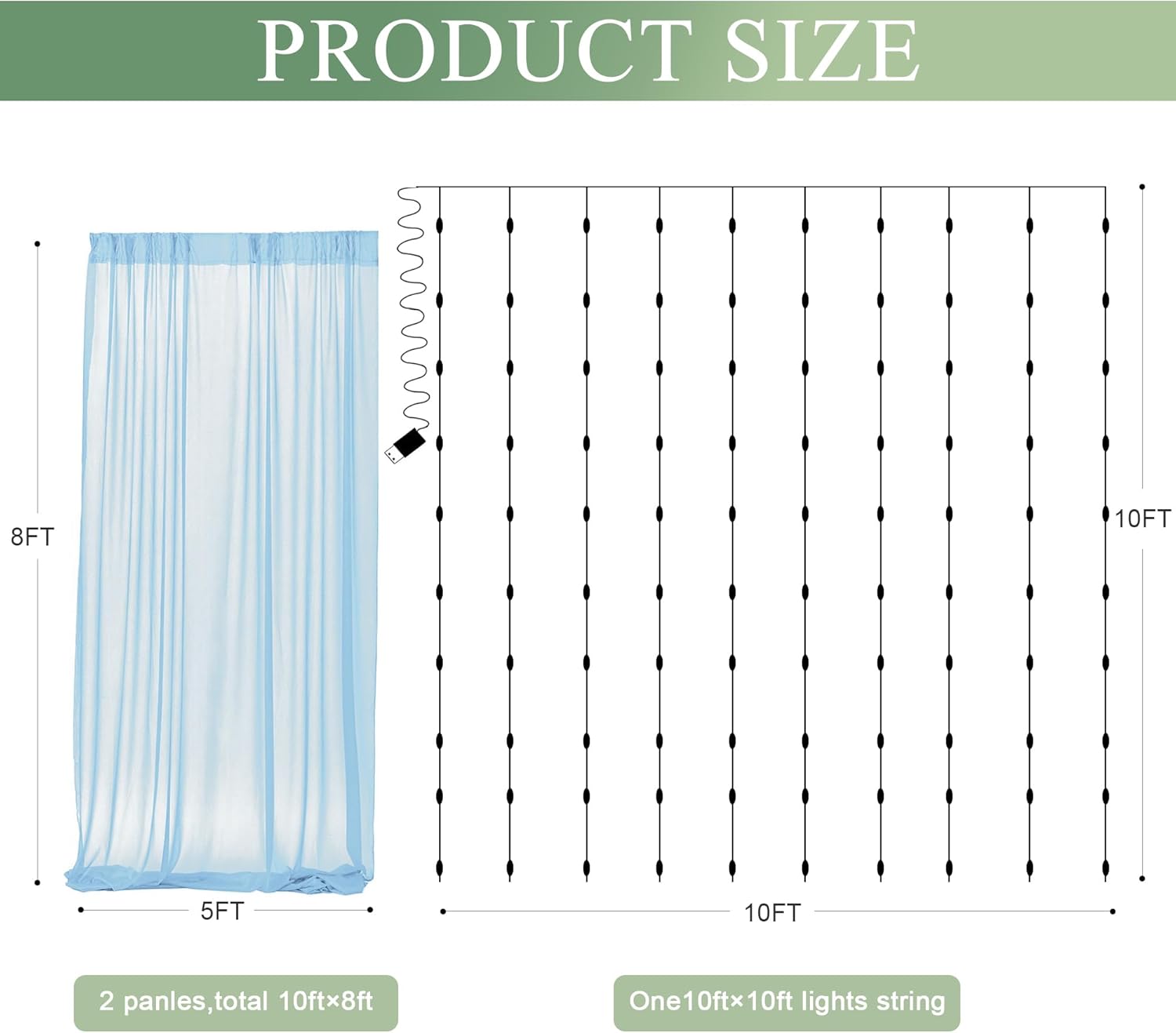 - Package Includes: The package includes 2 panels soft baby blue curtain with lights, each panel tulle backdrop curtain size is 5FT width and 8FT height, a set of 10ft warm white string light (USB Powered) and 12pcs Transparent clips.