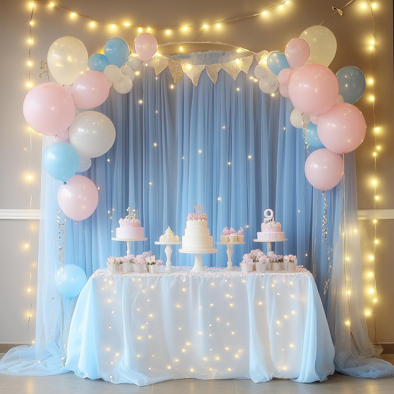 Tulle Backdrop Curtain with Lights String 10FT X 8FT Baby Blue Sheer Tulle Backdrop Curtains for Wedding Birthday Party Reception Photo Booth Background Decorations (2 Panels 5x8FT)