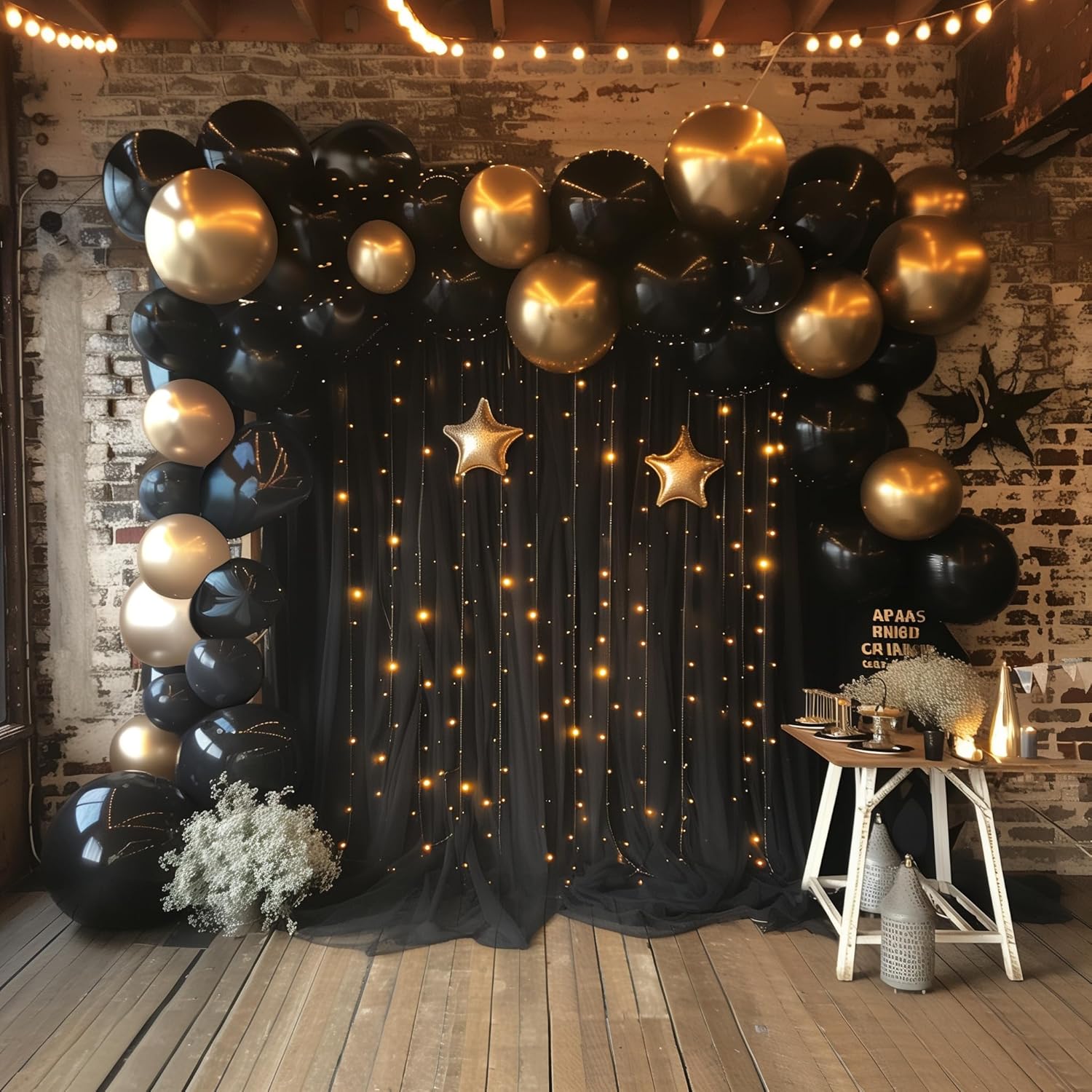 Tulle Backdrop Curtain with Lights String 10FT X 10FT Black Sheer Tulle Backdrop Curtains for Wedding Birthday Party Reception Photo Booth Background Decorations (2 Panels 5x10FT)