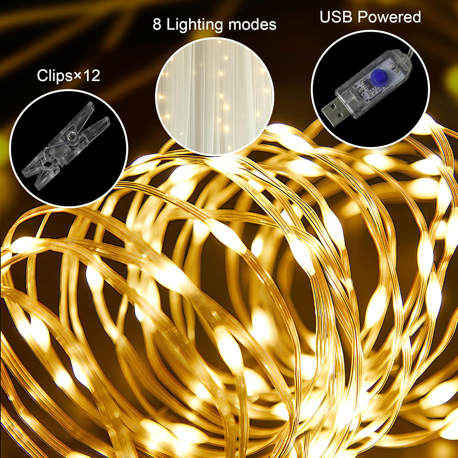 - Package Includes: The package includes 2 panels soft ivory curtain with lights, each panel tulle backdrop curtain size is 5FT width and 10FT height, a set of 10ft warm white string light (USB Powered) and 12pcs Transparent clips.