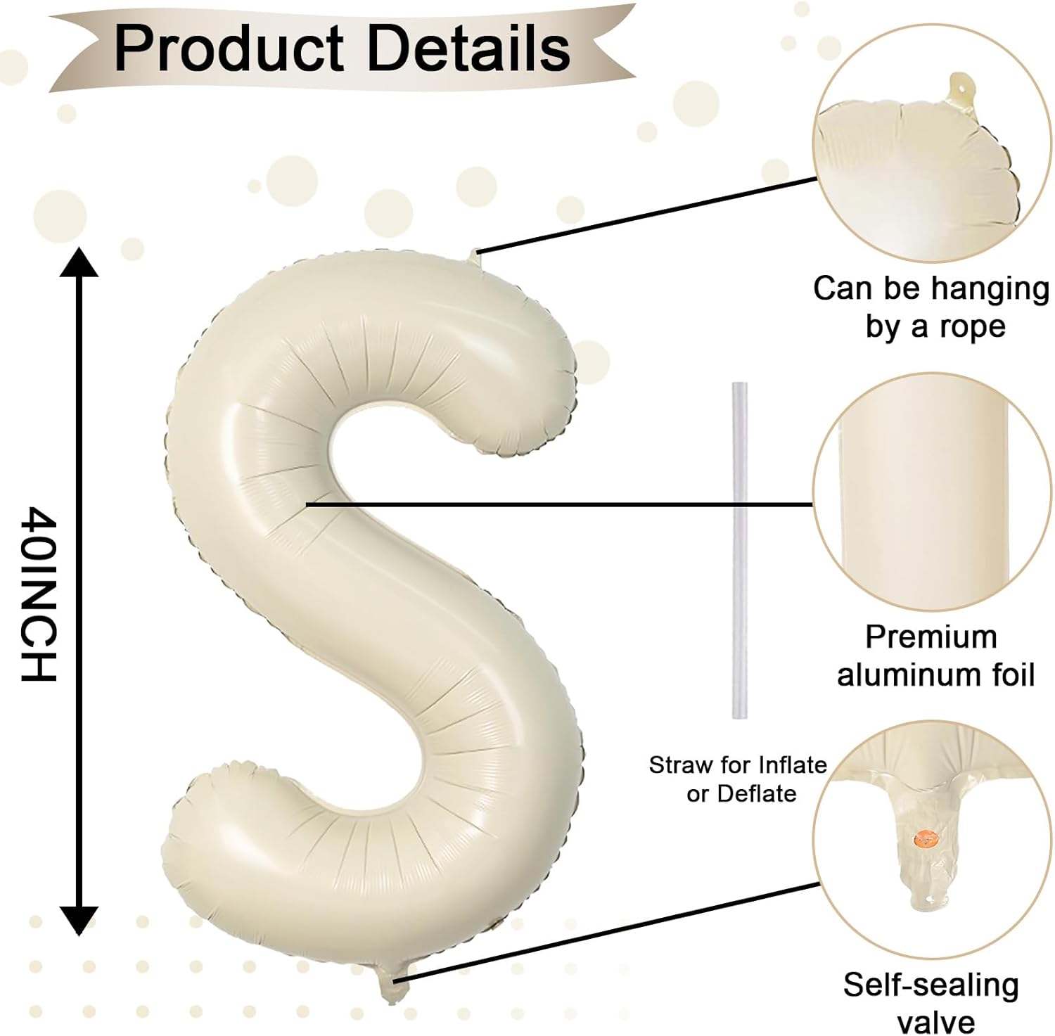 - Cream White Letter S Balloon 40 Inch: Includes 1pc giant beige "S" letter balloon and 1 straw for easy inflation and deflation. Our elegant big beige balloons are perfect for personalized parties. With 26 letters (A-Z) and numbers (1-9) available, you can mix and match to fit your theme.