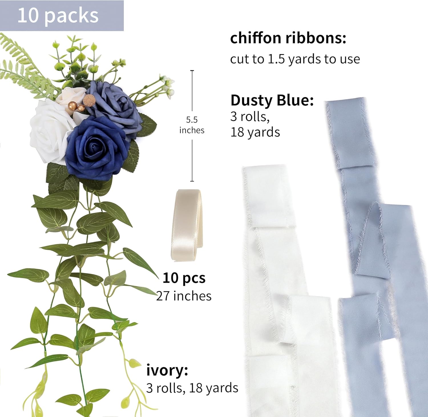 - Details: open big dark blue / dusty blue / white roses, open small cream rose, gold beads, clematis leaves, green eucalyptus leaves make the whole pew flower approx 5.5" diameter; chiffon fabric drapes folded length 1.5yards, and the silk-like ribbons are ivory and dusty blue; extra one 70cm ribbon attached for easy tying.