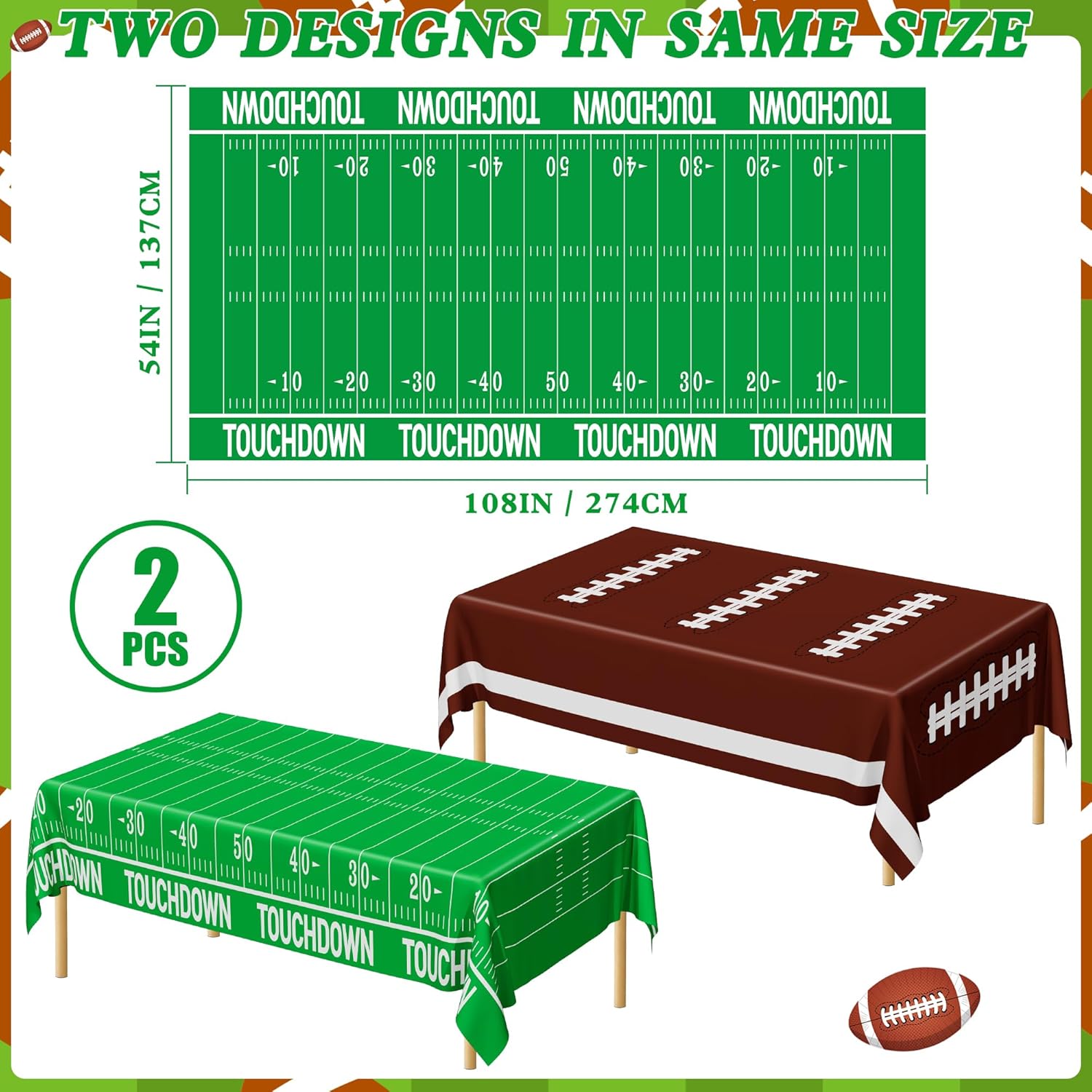 - Dimensions & Quantity: Each pack contains two football table cloths, each measuring 108 inches in length and 54 inches in width, providing ample coverage for standard-sized tables.