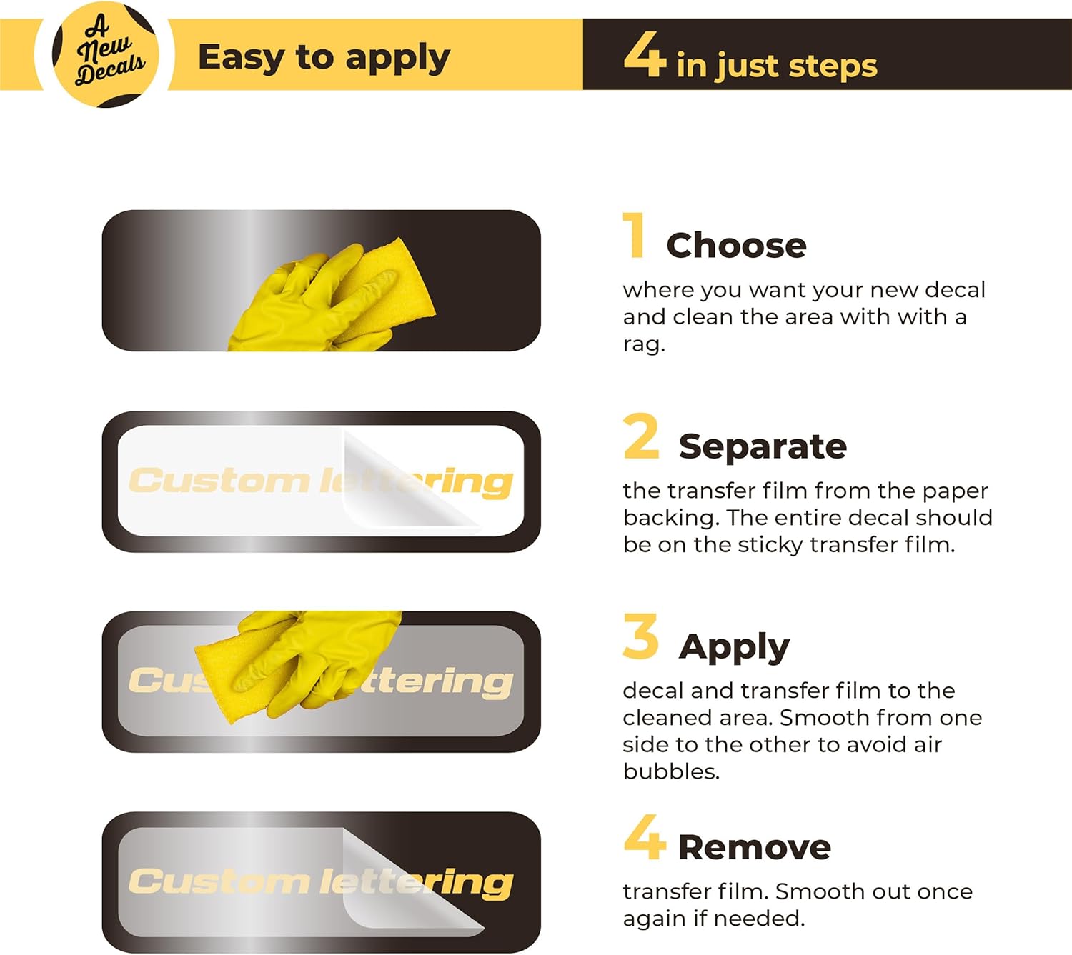 - SIMPLE CUSTOMIZATION: Personalize your custom window decals easily. Enter your text, and select your preferred font, color, and size. Create custom decals that are unique and exactly how you want them.