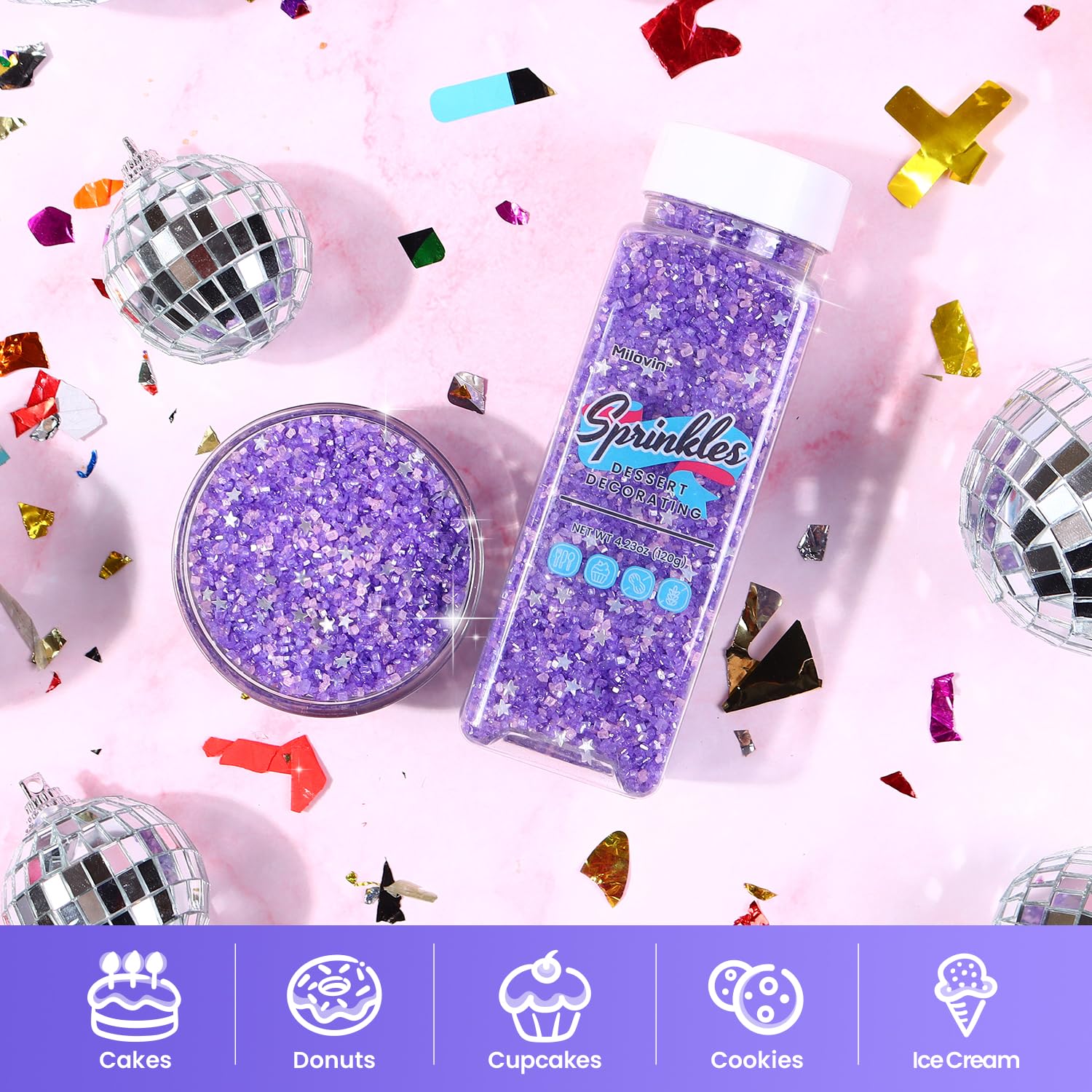 - Sanding Sugar: Sugar crystal sprinkles have a mixture of metallic silver glitter stars, pink, and purple sprinkles. Add vibrant shimmering colors and texture to cakes, cookies, cupcakes, ice cream, sugar, and other baked. It will make your dessert shine like no other, make them more gorgeous and appealing