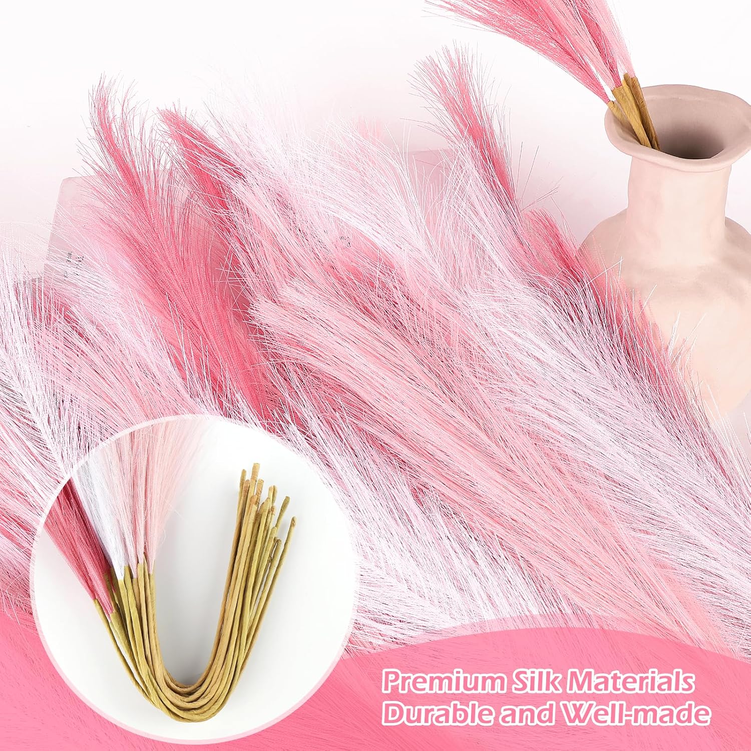 - DURABLE & MAINTENANCE-FREE: Our pampas grass is made from premium silk that mimics the gentle, feathery texture of natural grass. It stays intact without shedding, and its long, sturdy strands promise enduring attractiveness and durability.
