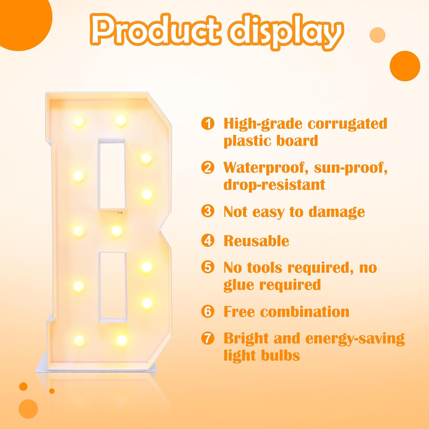- Reusable Large Light Up Letters: While others may use single-use KT boards, our large marquee for letters are made from corrugated plastic board, offering versatility and reuse. After your event, simply disassemble light up marquee for letters into components that can serve multiple purposes. Rather than discarding big letters for party, explore how they can be applied in different ways, extending their functionality and value