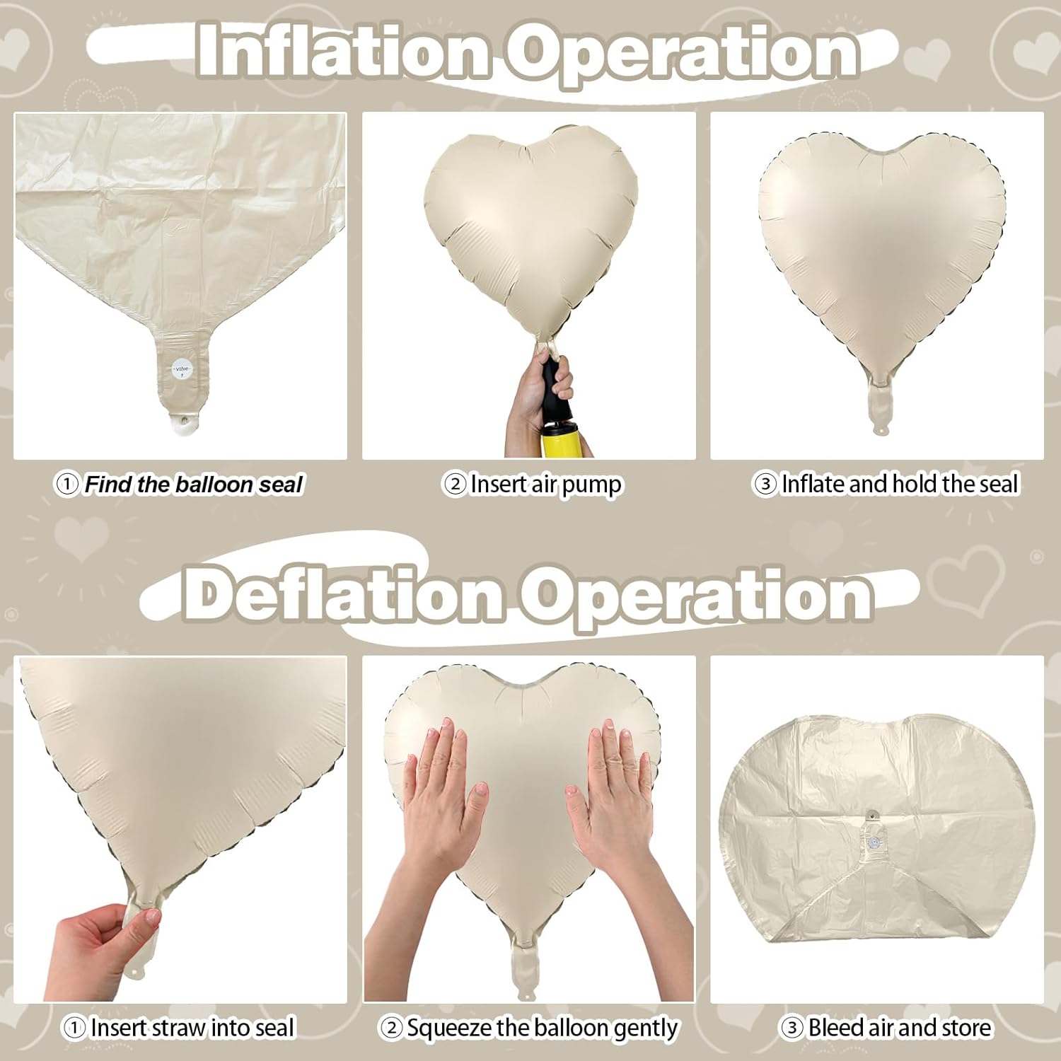 - Easy to Use: The heart foil can inflate with helium or air, can be self-sealed. It is recommended to inflate to 80%-85% to prevent the balloon from bursting. Inflating with helium makes them float, enhancing the effect even more