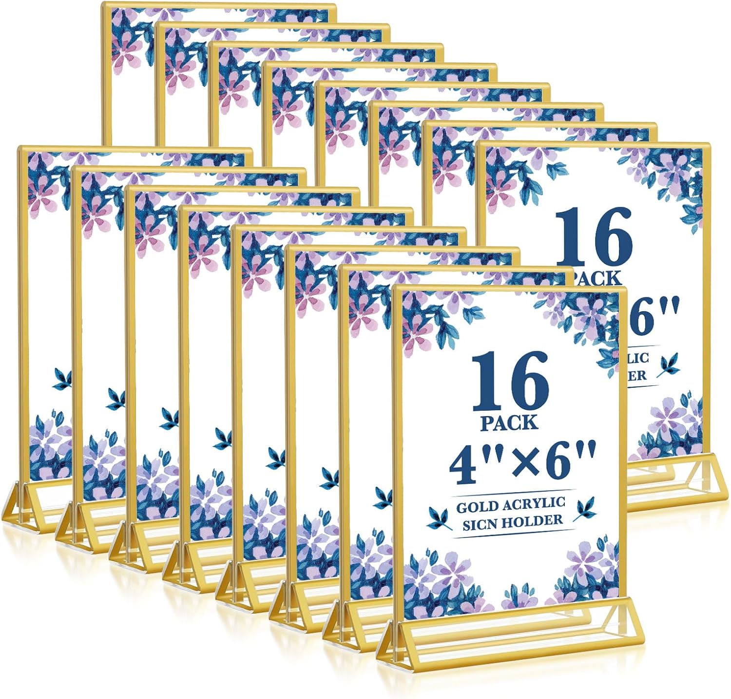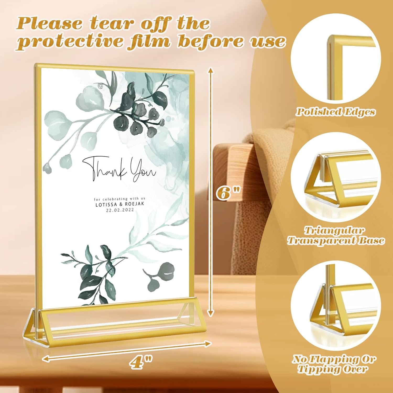 - 【Wide Application 】This set of 16 Pack 4x6 frame acrylic gold sign holders combines functionality with aesthetic appeal, ideal for elevating the ambiance of diverse events like weddings, baby showers, birthday parties, hotels, restaurants, cafes. This 4x6 gold frame with gold trim will be a great way to cherish special memories in your home or as part of a table set up on your big day.
