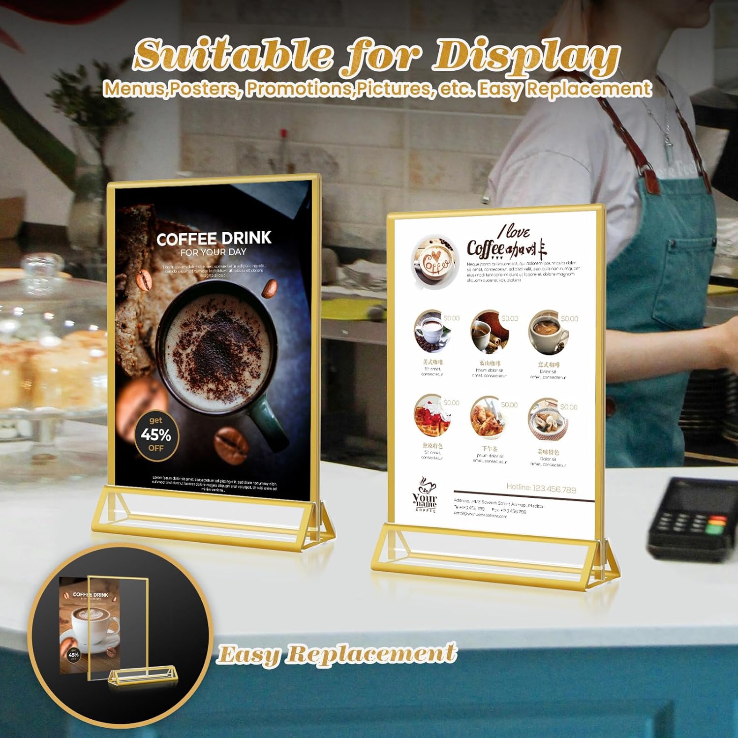 - 【Double-Sided Display Design】This uniquely designed 16 Pack 4x6 gold acrylic sign holder features a back-to-back double-sided display design. Its vertical double-sided structure ensures clear visibility of two photos or menu signs, making your table arrangement practical and visually appealing from any angle.