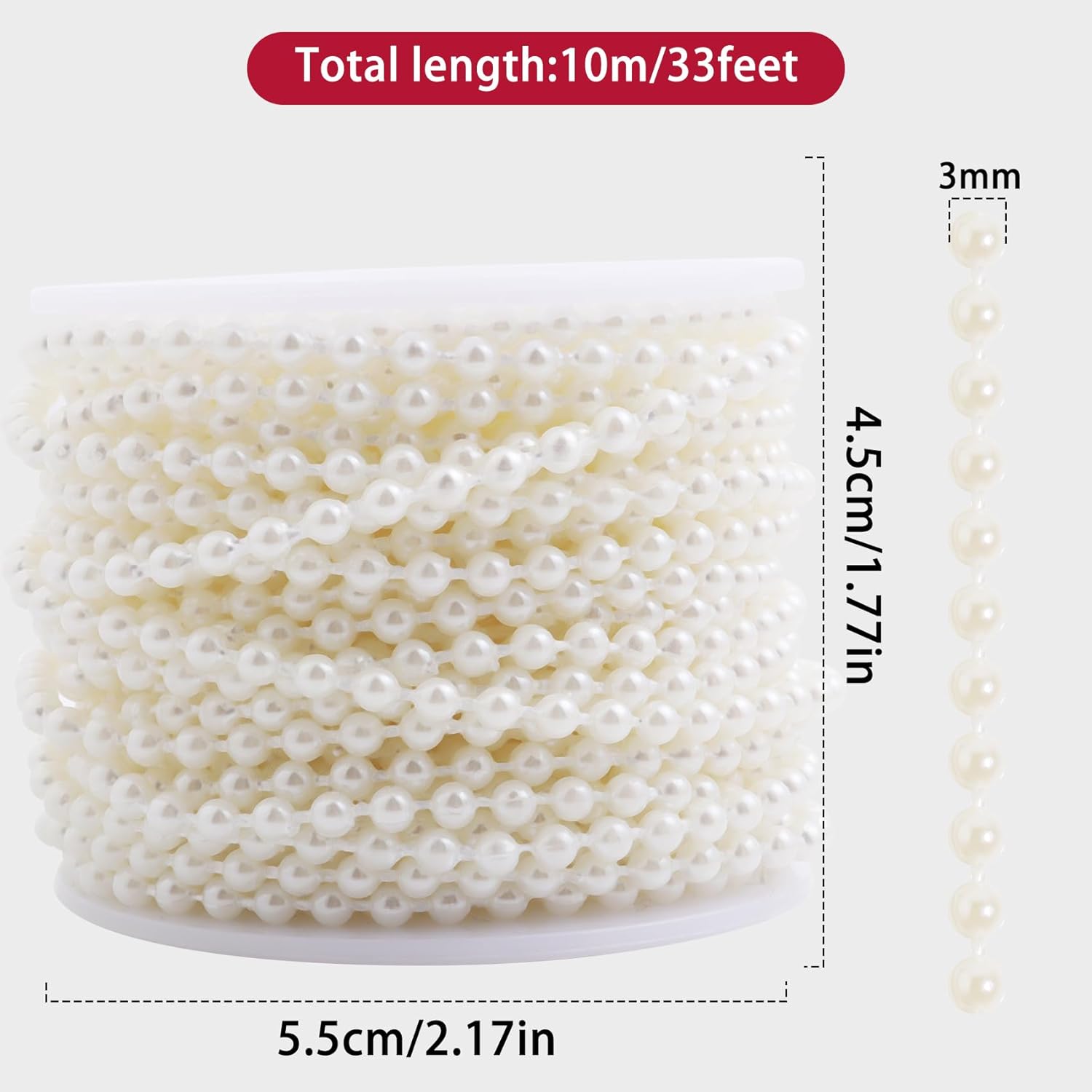 - Size: each roll of pearl chain has a total length of 33 feet/10 metres. The diameter of artificial pearls is 3mm. Please check the size before purchasing