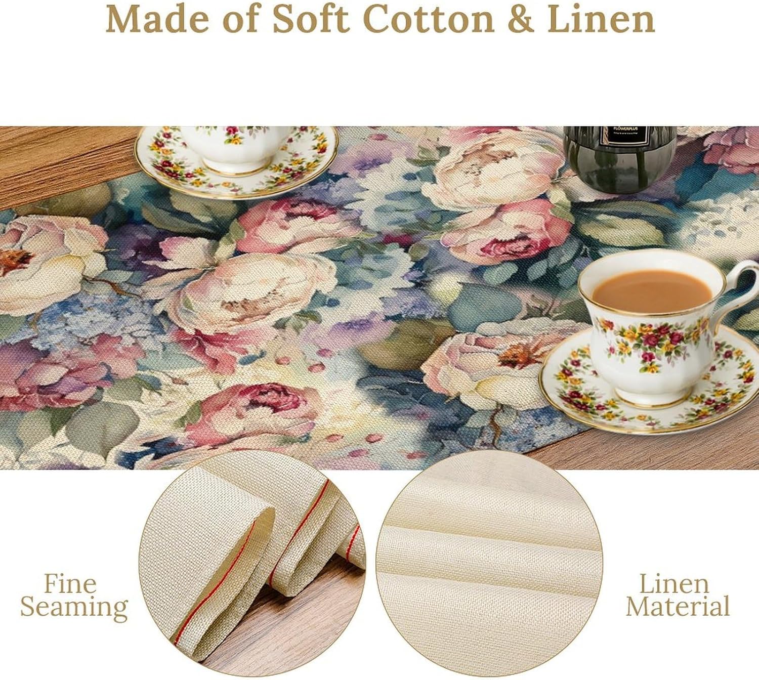 Vintage Floral Table Runner,Girls Women Rose Romantic Leaf Botanical Watercolor Pattern Print Burlap for Hotel Indoors Outdoor Dining Room Kitchen Holiday Party, 13x60in