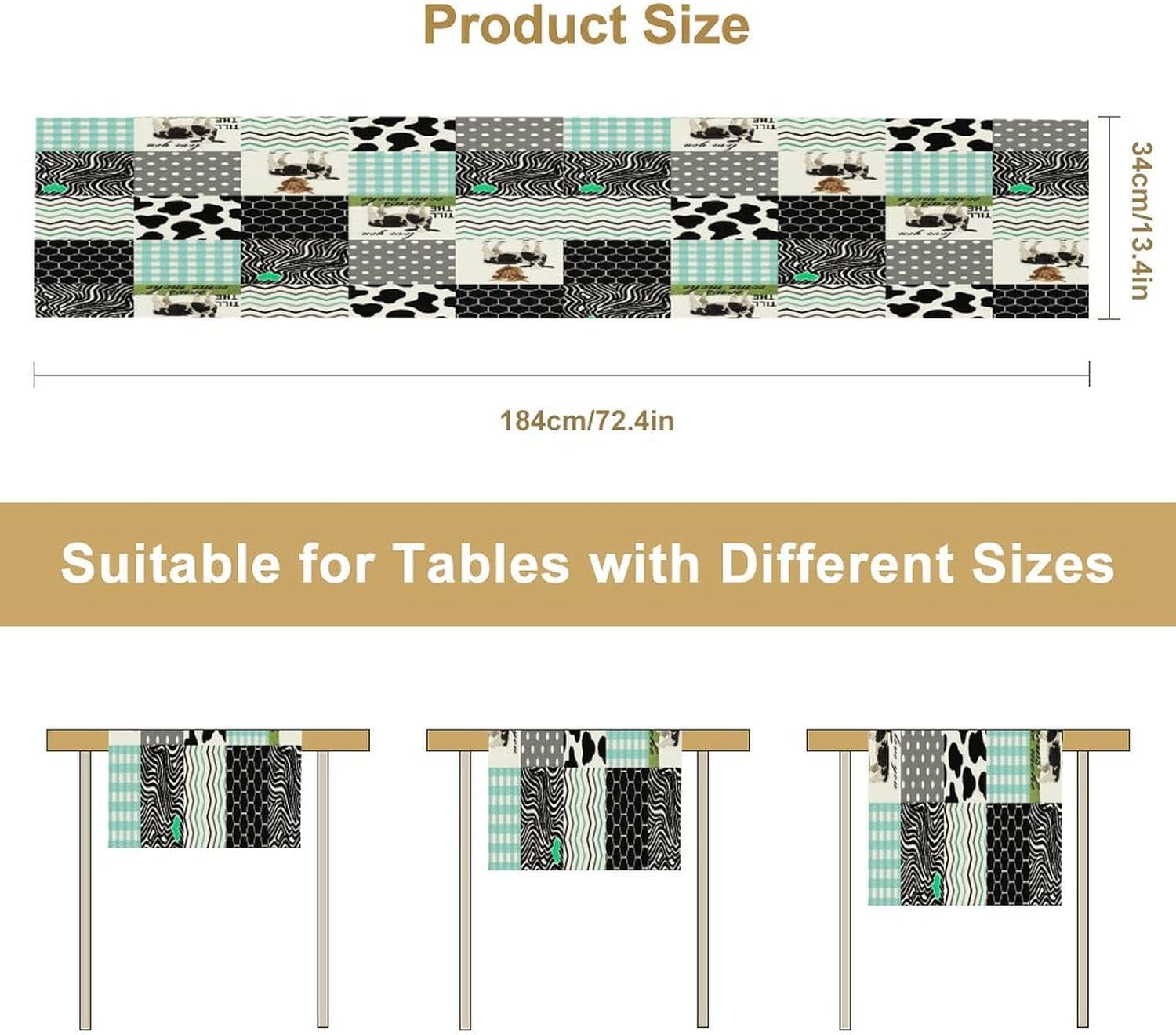 Cute Cow Print Table Runner,Farm Animals Honeycomb Plaid Stripes Cowhide Pattern Tablecloth Burlap for Hotel Indoors Outdoor Dining Room Kitchen Table Decor, 13x90in