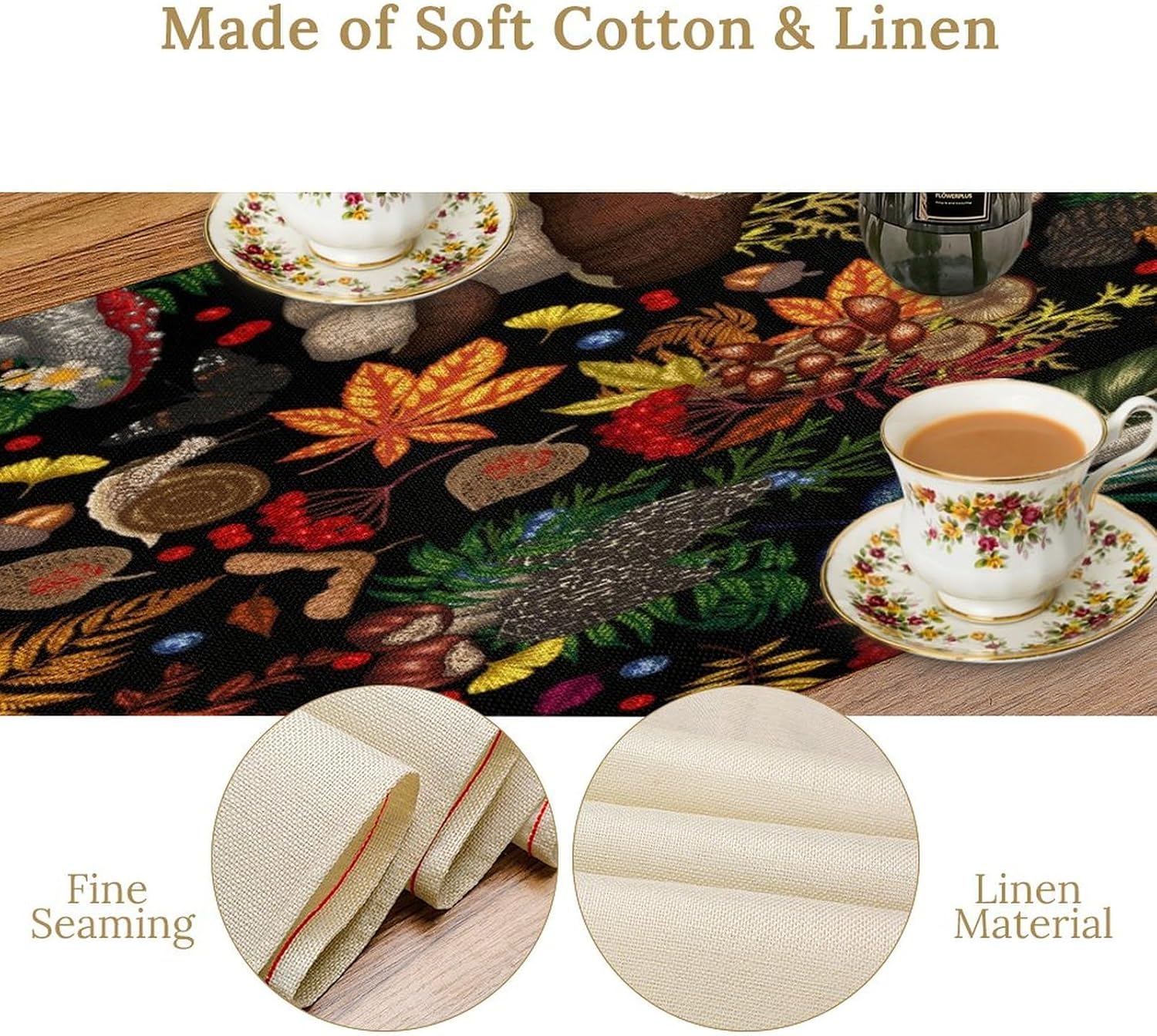 Nature Mushroom Table Runner,Retro Boho Floral Botanical Plant Forest Pattern Print Tablecloth Burlap for Hotel Indoors Outdoor Dining Room Kitchen Holiday Party, 13x80in