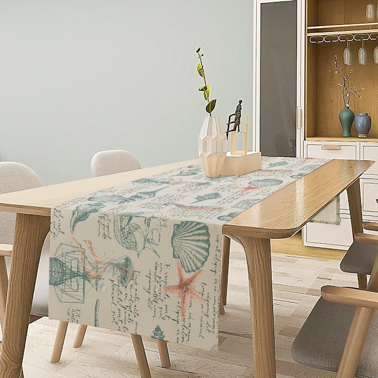Starfish Table Runner,Seashells Beach Coastal Nautical Sailboat Jellyfish Vintage Hand Drawn Burlap for Hotel Indoors Outdoor Dining Room Kitchen Table Decor, 13x60in