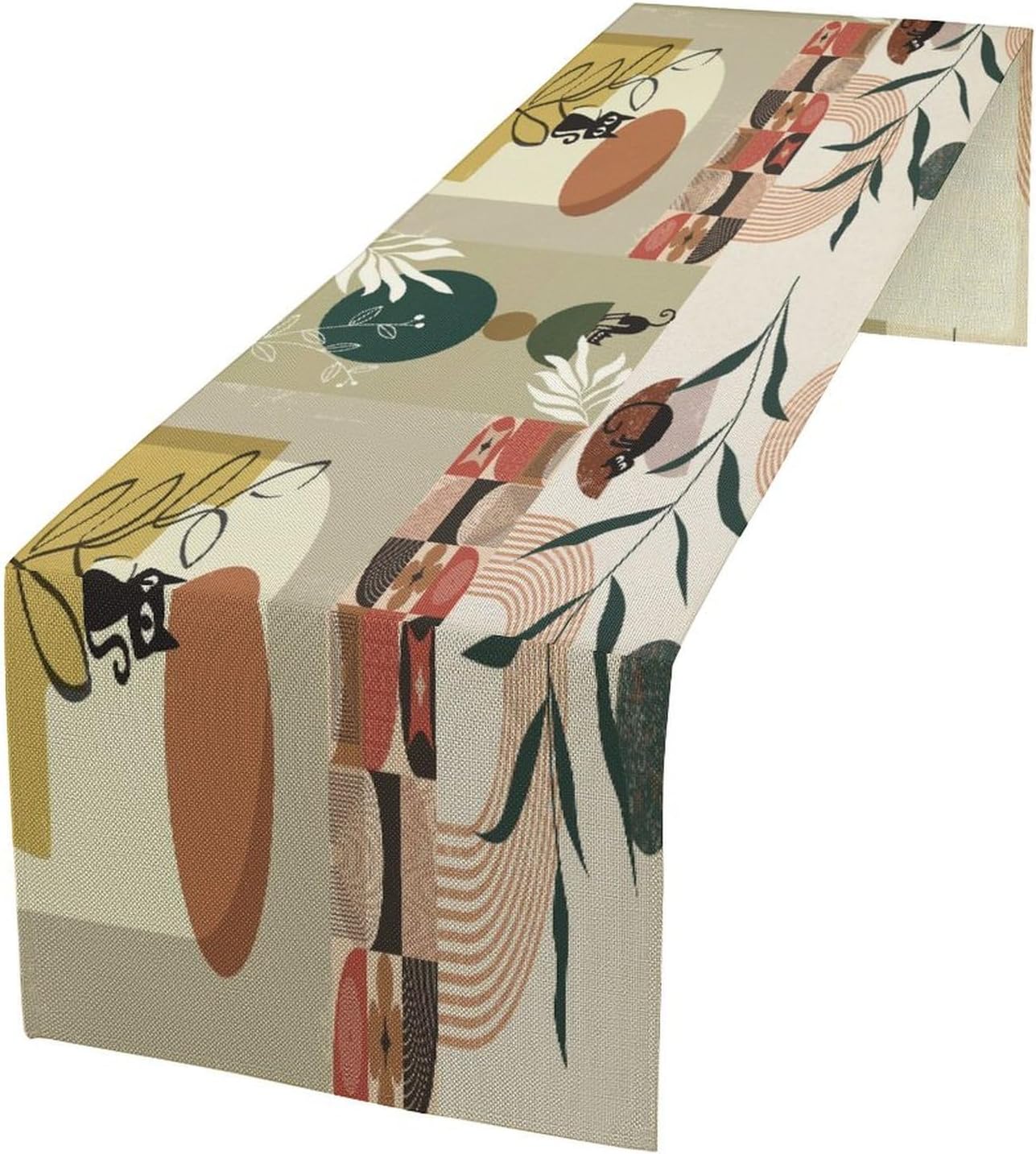 Mid Century Table Runner,Abstract Boho Plant Leaf Botanical Cat Modern Geometric Pattern Print Burlap for Hotel Indoors Outdoor Dining Room Kitchen Home Decor, 13x60in