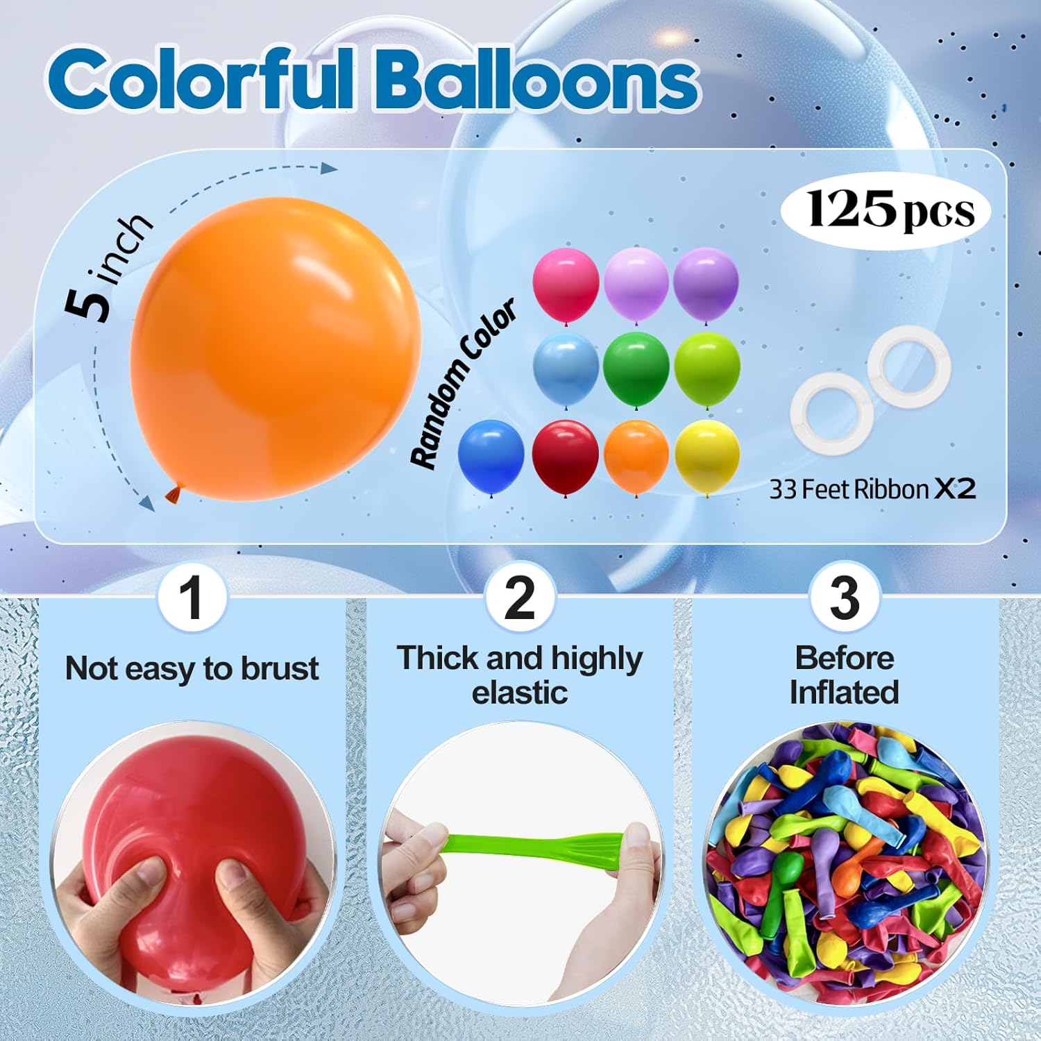 - 【Size & Quantity】 Each sets contains 125pcs 5 inch small balloons, the latex balloons is various colors(Delivered randomly), mini rainbow balloons are safe, heavy thick, bouncy and Eco-friendly latex material which is durable and long-lasting quality, these balloons Thicker and much strong than typical balloons for longer lasting fun.