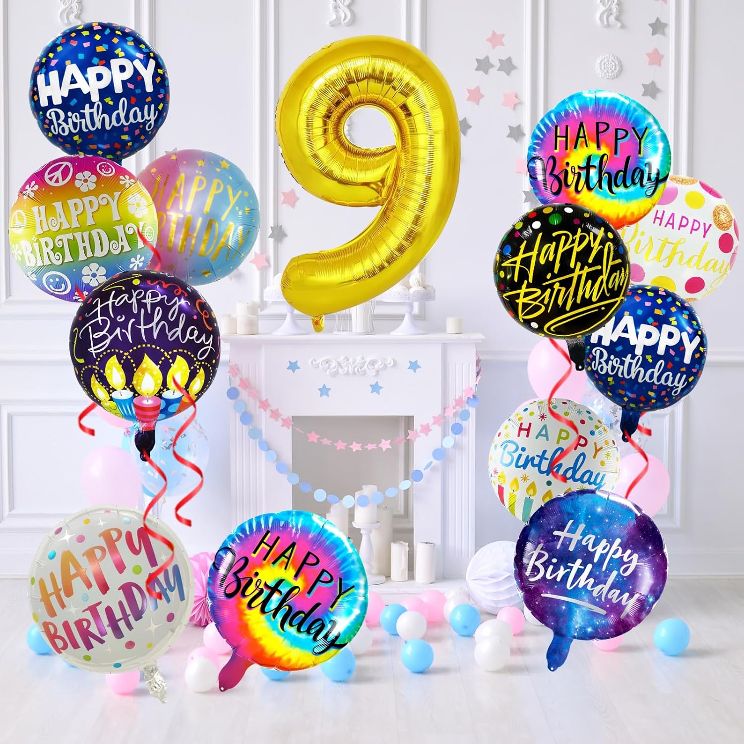 50 Pcs Happy Birthday Party Aluminum Foil Balloons and 9th Balloons, 18 Inch Round Aluminum Foil Balloon with" Happy Birthday" Sign, Birthday Party Decorations for Boys/Girls (Yellow, 9)