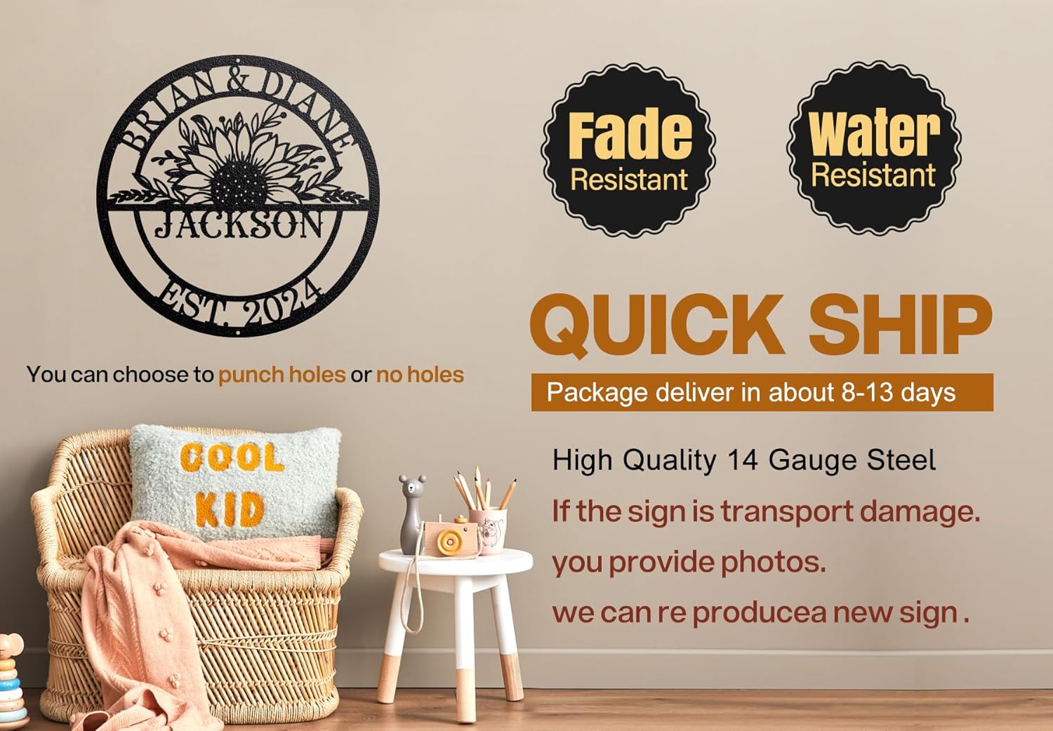 - Metal Sign Customization: Our artisans skillfully personalize each sign with intricate monograms, floral accents, and your preferred color scheme, ensuring a one-of-a-kind piece that perfectly captures your style and personality.