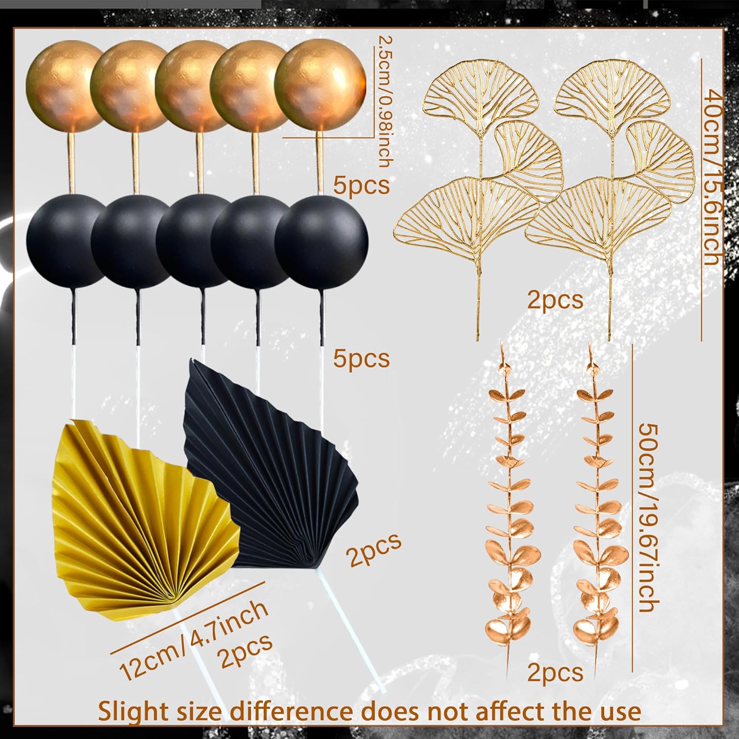 - You will get: 5 Xgold cake balls, 5X black cake balls, 4X two different leaves, 2X black folding fans, 2X gold folding fans. The size is as shown in the picture, this is a perfect set of cake toppers to meet your DIY needs!