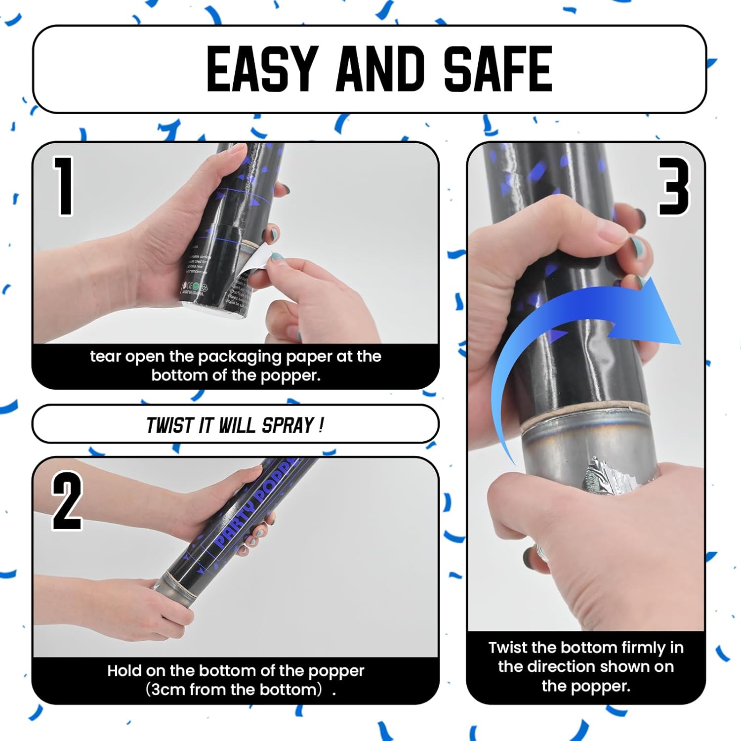 - Blue Color Confetti Poppers - Find confetti cannon hard to twist to pop?Maybe you got a wrong way to use confetti poppers. To avoid awkward silence in the beginning, please read the instructions and tear open the packaging paper at the bottom of the popper, then easy to twist it!