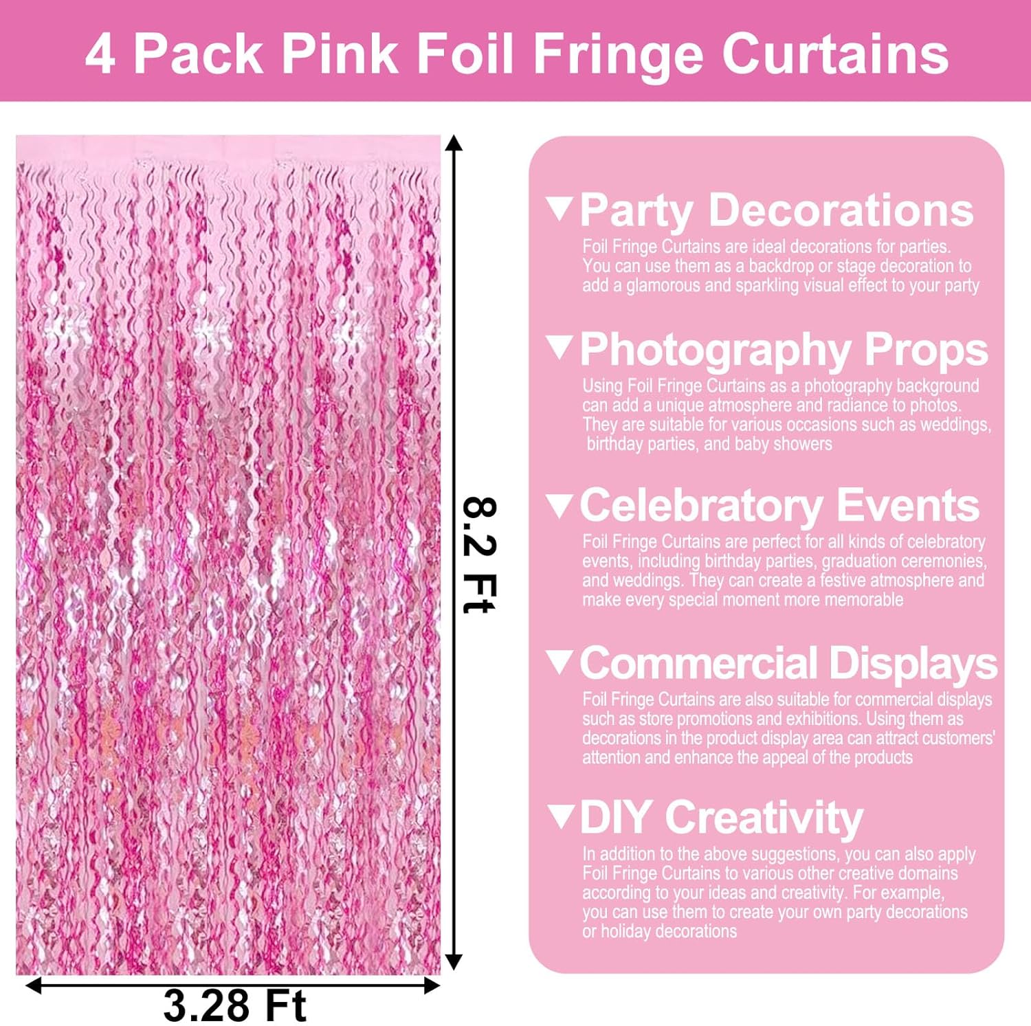 4 Pack Pink Wave Foil Fringe Curtain Backdrop, 3.28Ft x 8.2Ft Metallic Tinsel Foil Fringe Streamer Curtains for Photo Booth, Mother's Day, Easter, Birthday, Wedding Party Decoration
