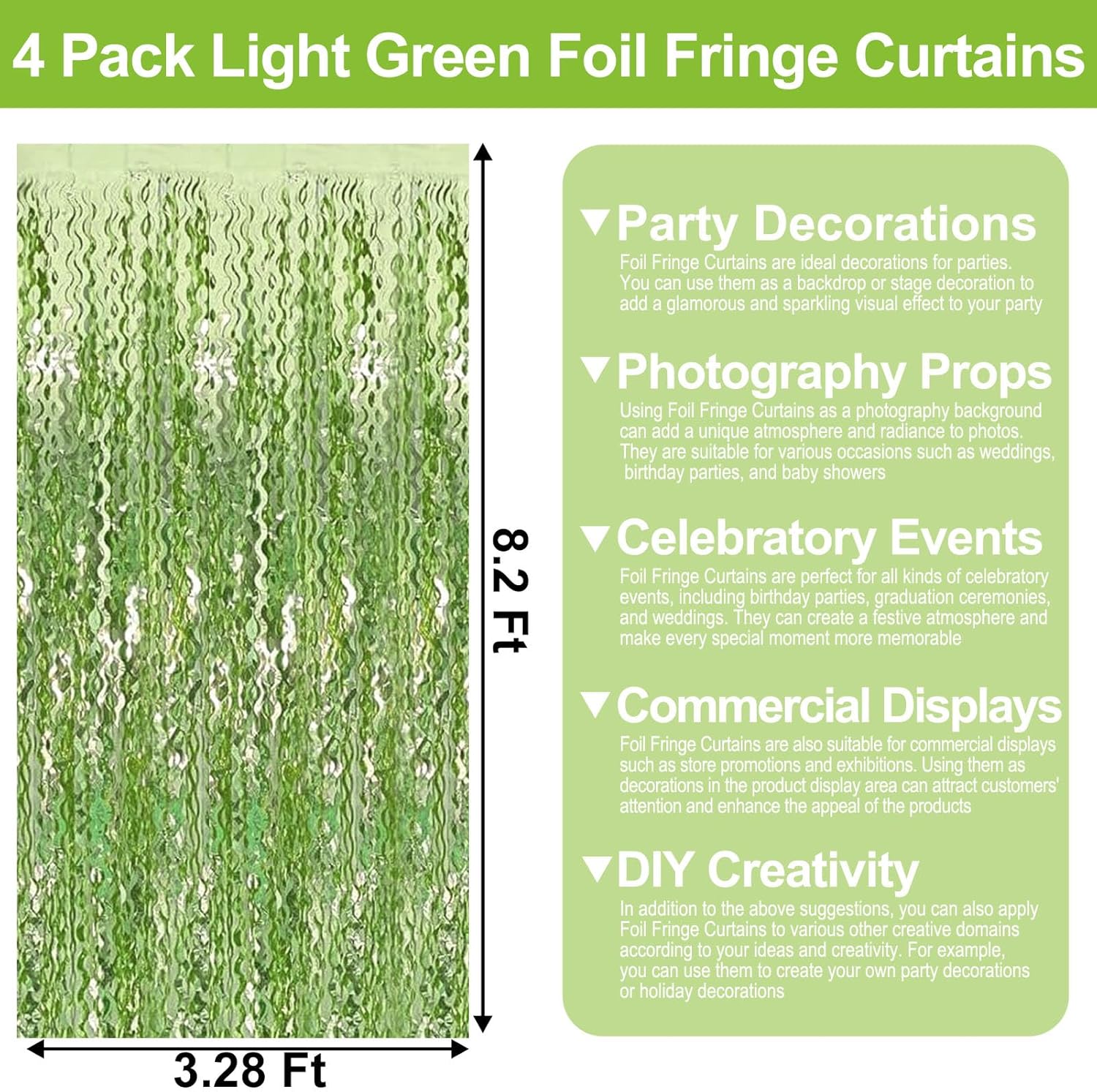 4 Pack Light Green Wave Foil Fringe Curtain Backdrop, 3.28Ft x 8.2Ft Metallic Tinsel Foil Fringe Streamer Curtains for Photo Booth, Mother's Day, Easter, Birthday, Wedding Party Decoration