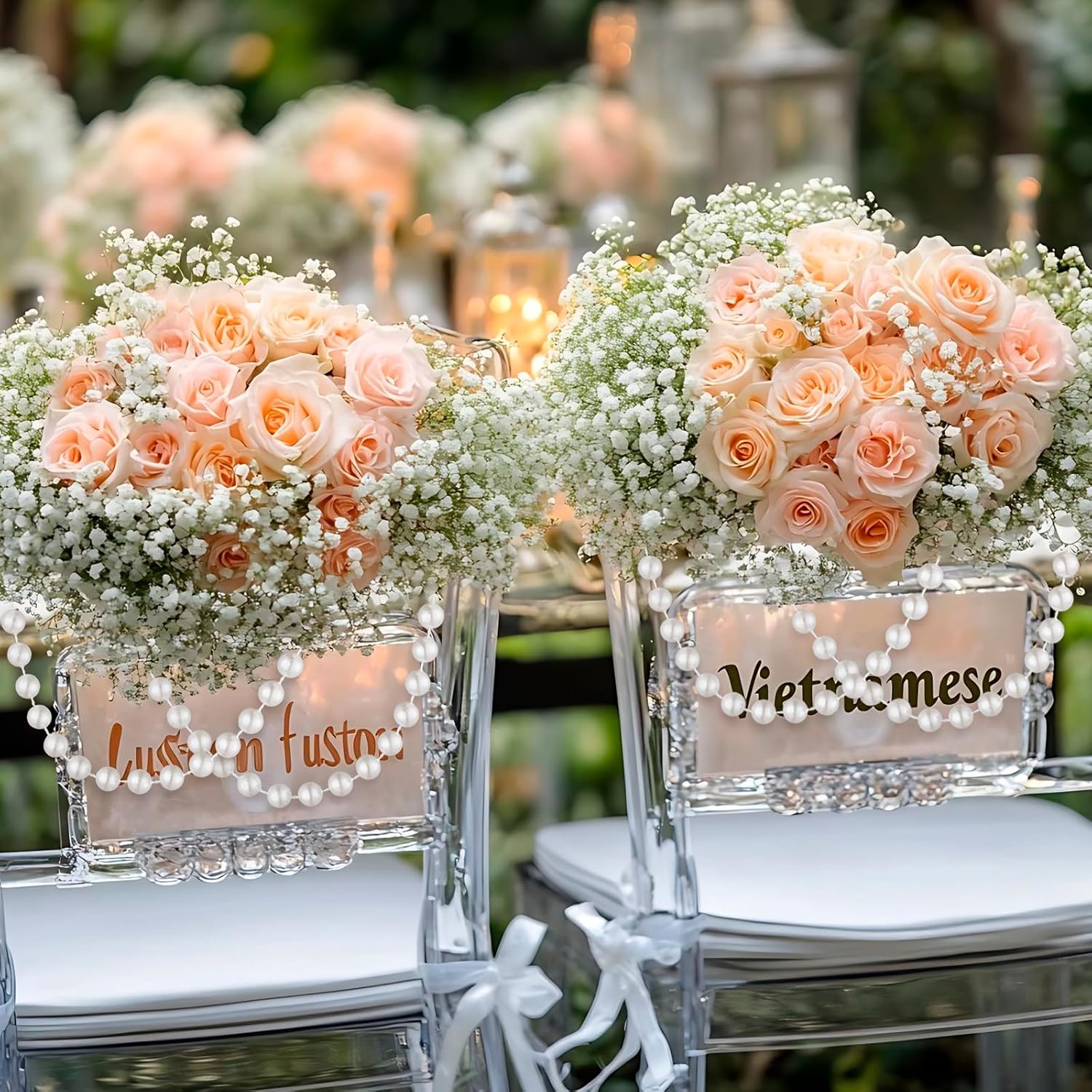 - Faux Pearl String uses: christmas pearl string not only be used for christmas and wedding decorations, events, exhibitions, receptions and other different scenes,pearl strands for decorating can also be used to decorate bridal bouquets, dresses, hairpins, tables, chairs, cakes, lamp shades, chandeliers,necklaces and more