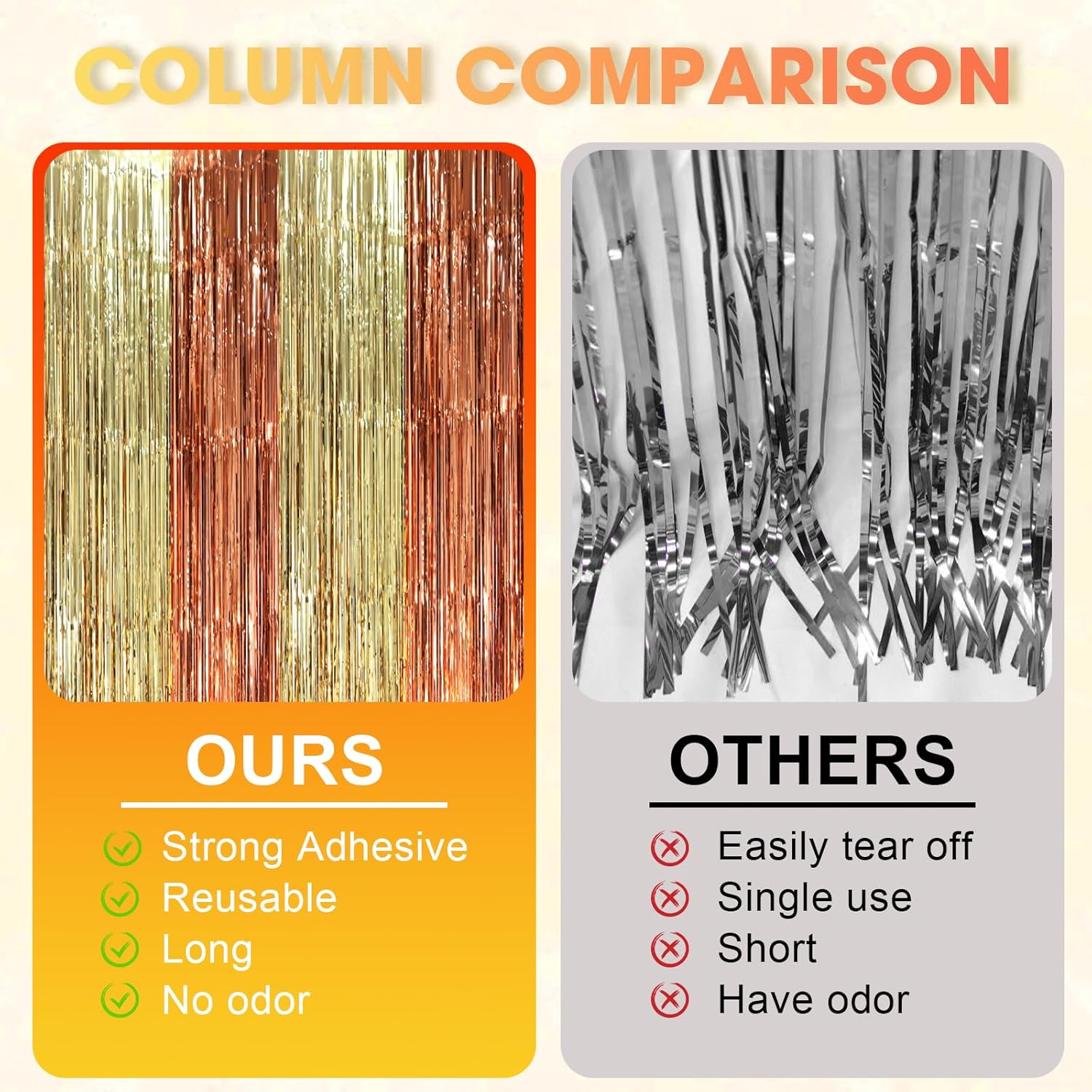 - Package Included: 3 packs of rose gold and champion foil fringe curtains, the size of the foil curtain is 3.3*8.2ft. It's long enough to fit any occasion