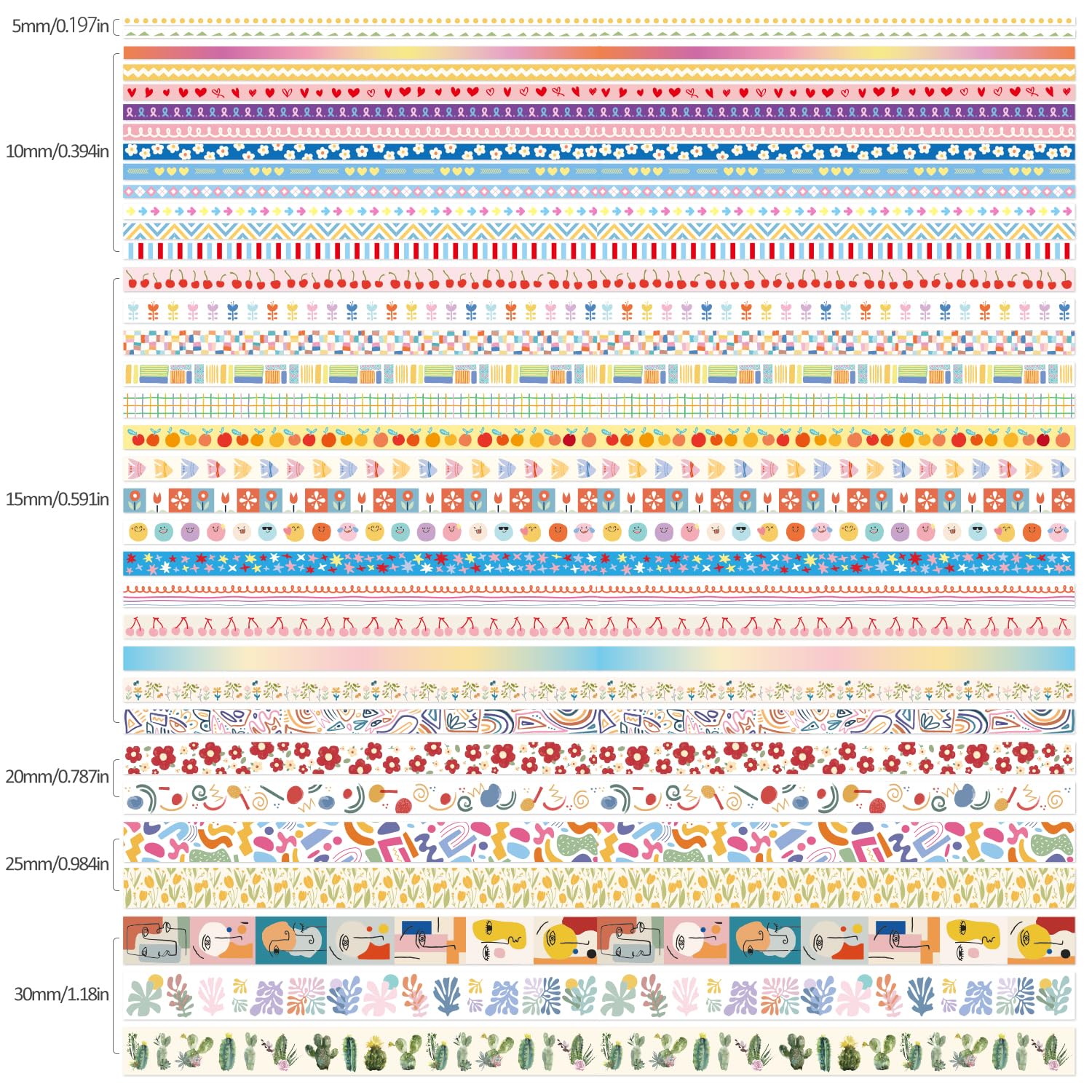 - 35 Rolls Washi Tape,1.18 inch (30mm) wide x 3 tapes; 0.98 inch (25mm) wide x 2 tape; 0.79 inch (20mm) wide x 2 tape; 0.59 inch (15mm) wide x 15 tapes; 0.39 inch (10mm) wide x 11 tapes; 0.19 inch (5mm) wide x2 tapes. These different series and sufficient quantity washi paper stickers can meet your use and replacement.