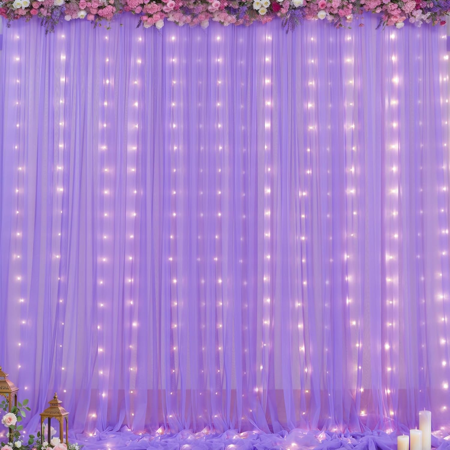 - Lavender Sheer Backdrop Curtain with Lights Occasions: Perfect for weddings, baby showers, bridal showers, birthday parties, anniversaries, New Year celebrations, family gatherings, and other occasions to create a memorable photo backdrop. The tulle backdrop curtains can be reused many times. For a fuller effect, consider purchasing multiple sets to use together