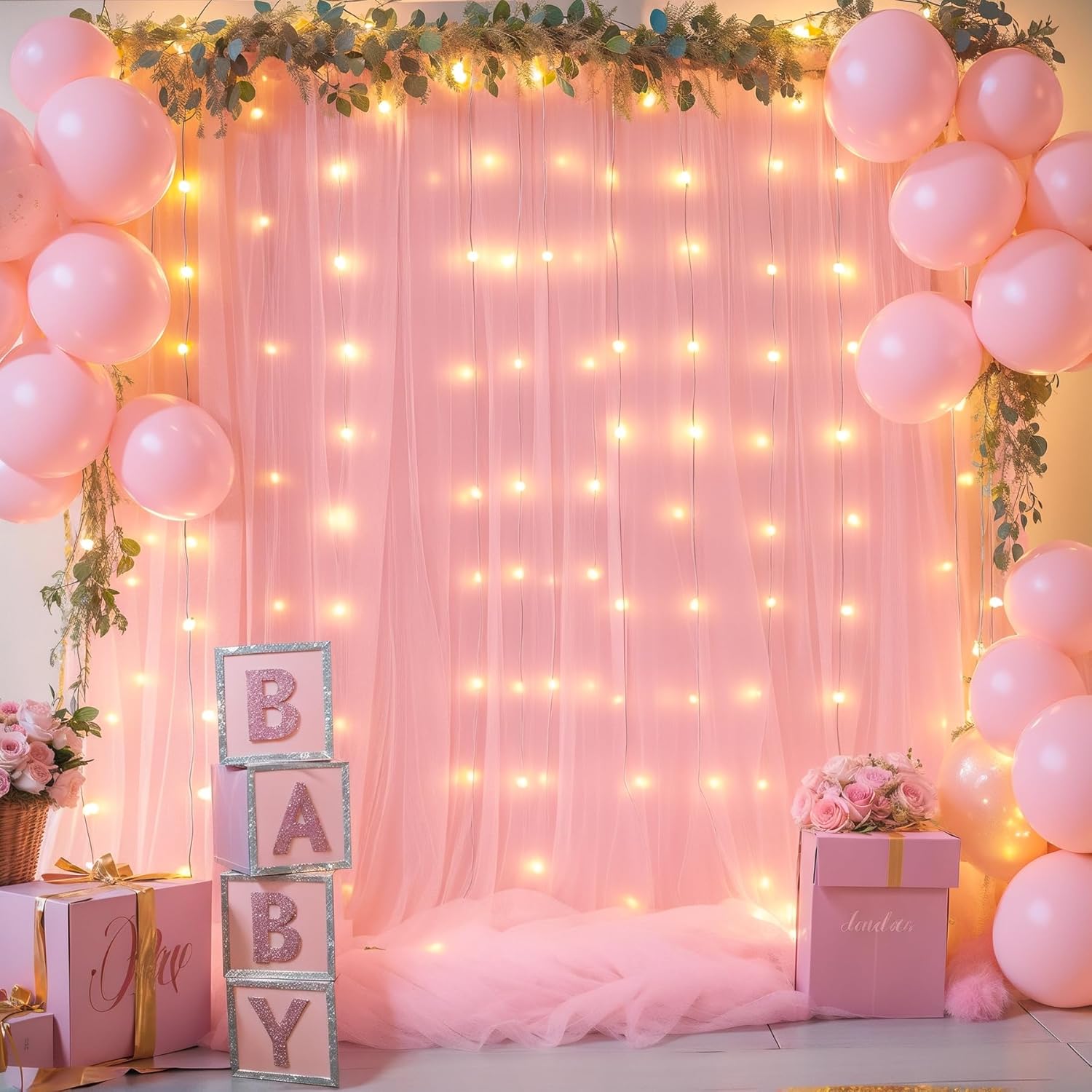 - Backdrop Curtains with Lights: Each set includes 4 pieces of 5x8ft pink sheer tulle backdrop curtains, 2 sets of 10 ft warm white LED string lights, and 24 clips. These sheer curtains with lights are perfect for baby shower photo booths or wedding reception backdrops, bringing a romantic and charming atmosphere to evening events
