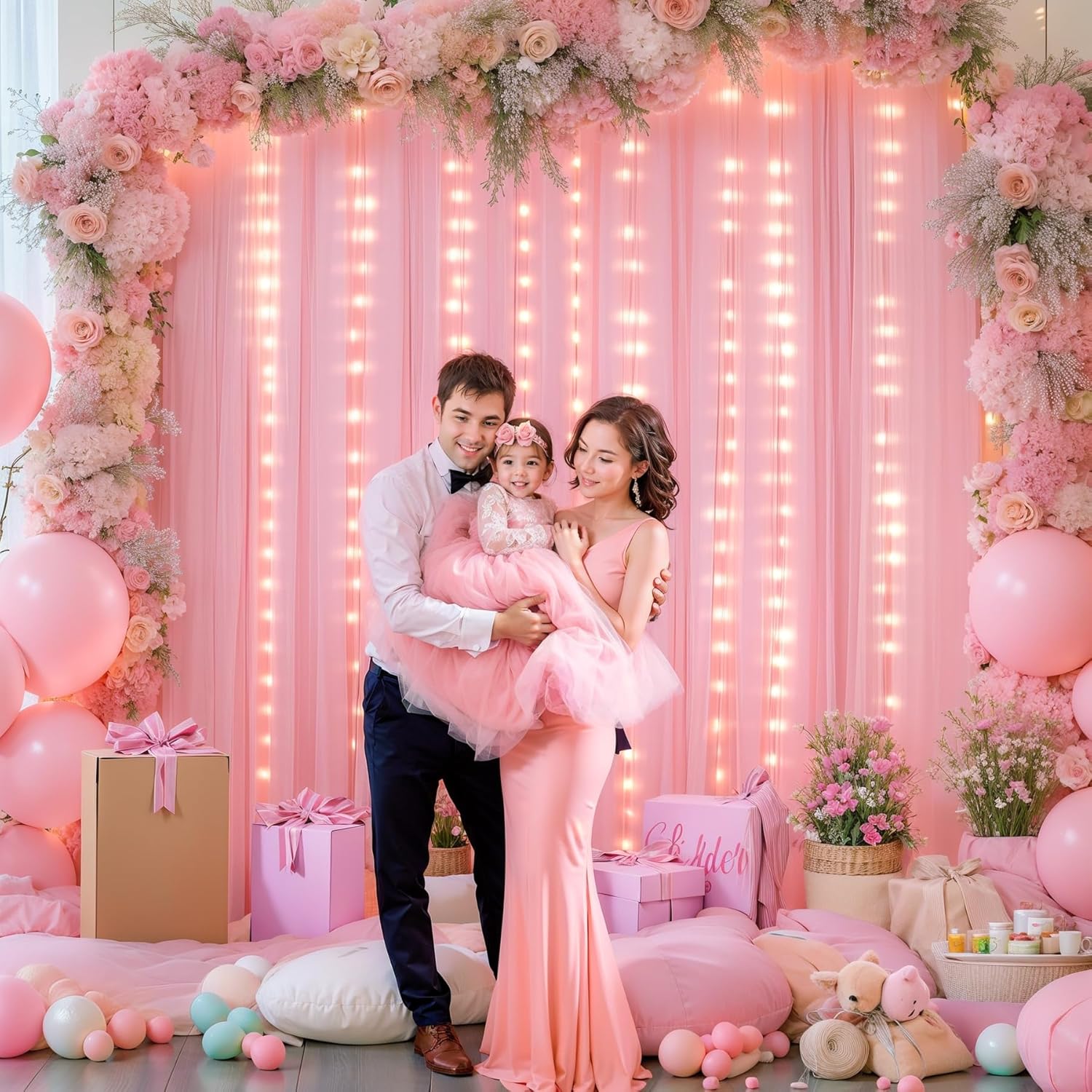 - Pink Sheer Backdrop Curtain with Lights Occasions: Perfect for weddings, baby showers, bridal showers, birthday parties, anniversaries, New Year celebrations, family gatherings, and other occasions to create a memorable photo backdrop. The tulle backdrop curtains can be reused many times. For a fuller effect, consider purchasing multiple sets to use together