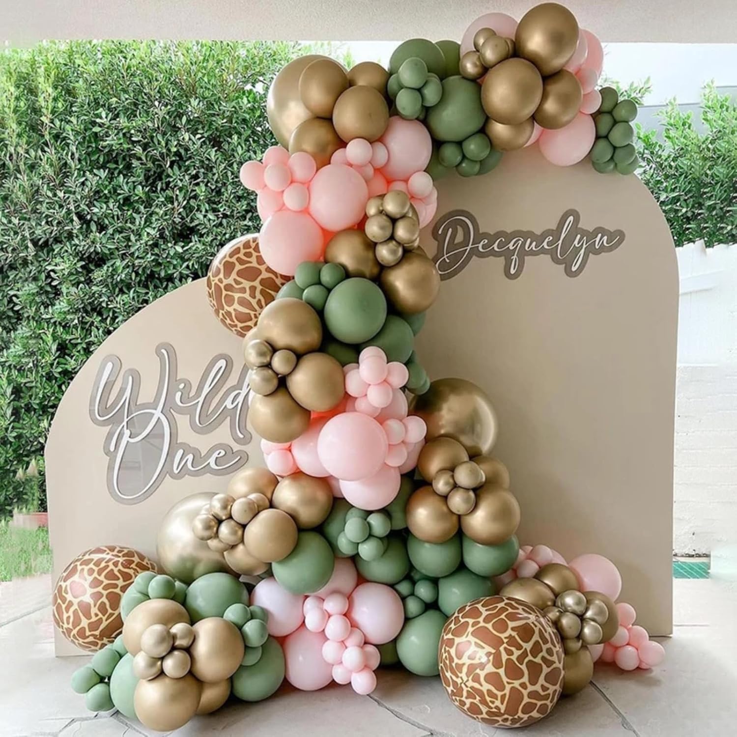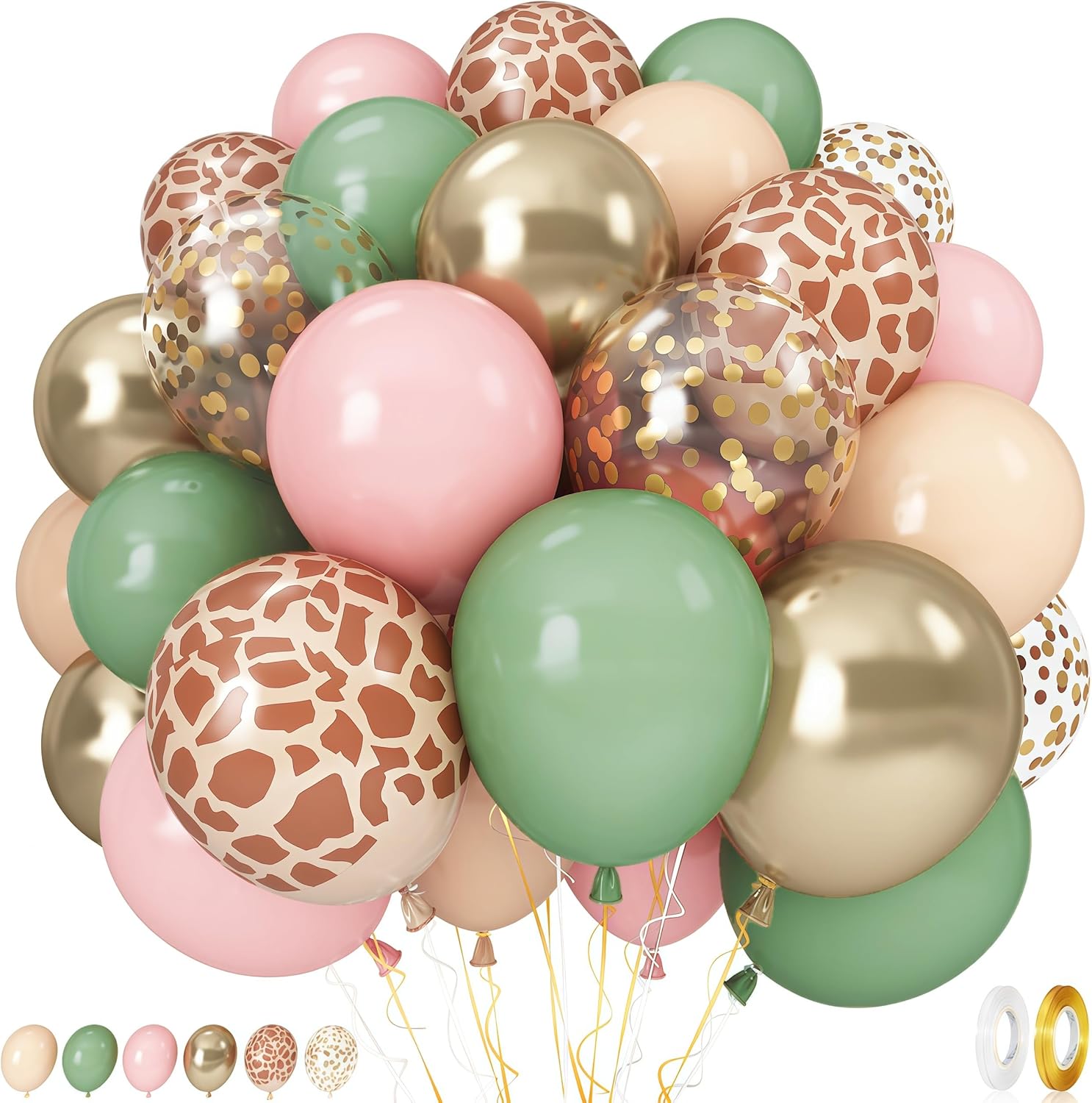 - Party Balloons Set: The pink safari balloons set have 60pcs 12 inch helium balloons, include 18pcs sage green balloons, 15pcs pastel pink balloons, 10pcs cream beige balloons, 6pcs metallic gold balloons, 6pcs giraffe print balloons, 5pcs gold confetti balloons, 2pcs white and gold balloon ribbon.