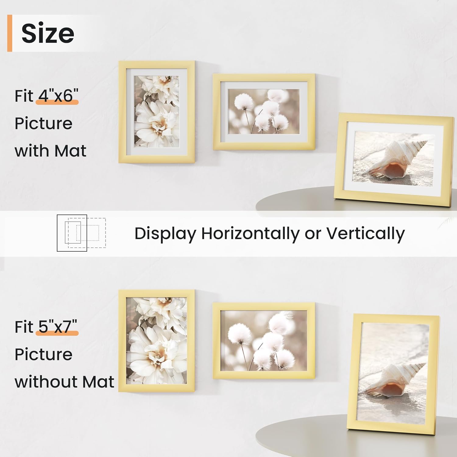- Vertical & Horizontal Display - Our wall photo frames are versatile and easy to clip and hang. You can mount this plastic picture frame horizontally or vertically, with hanging hardware included. This picture frame maximizes your available space.