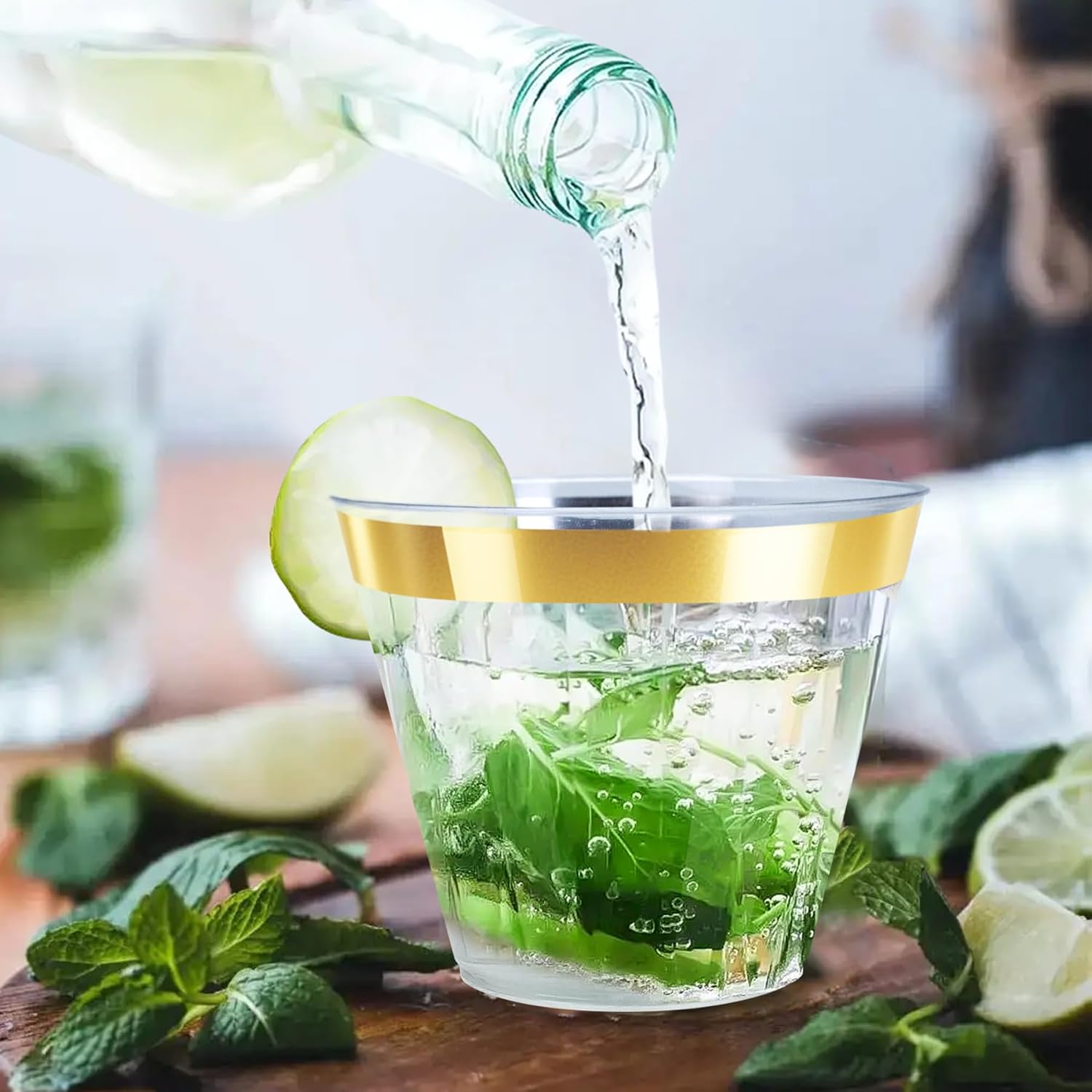 [200 Pack] 9oz Clear Plastic Cups with Gold Rimmed Sturdy & Food Safe Disposable Wine Glasses Party Wedding Cups Disposable Drinking Cups Plastic Cocktail Glasses for Wine, Juice & Cold Beverages