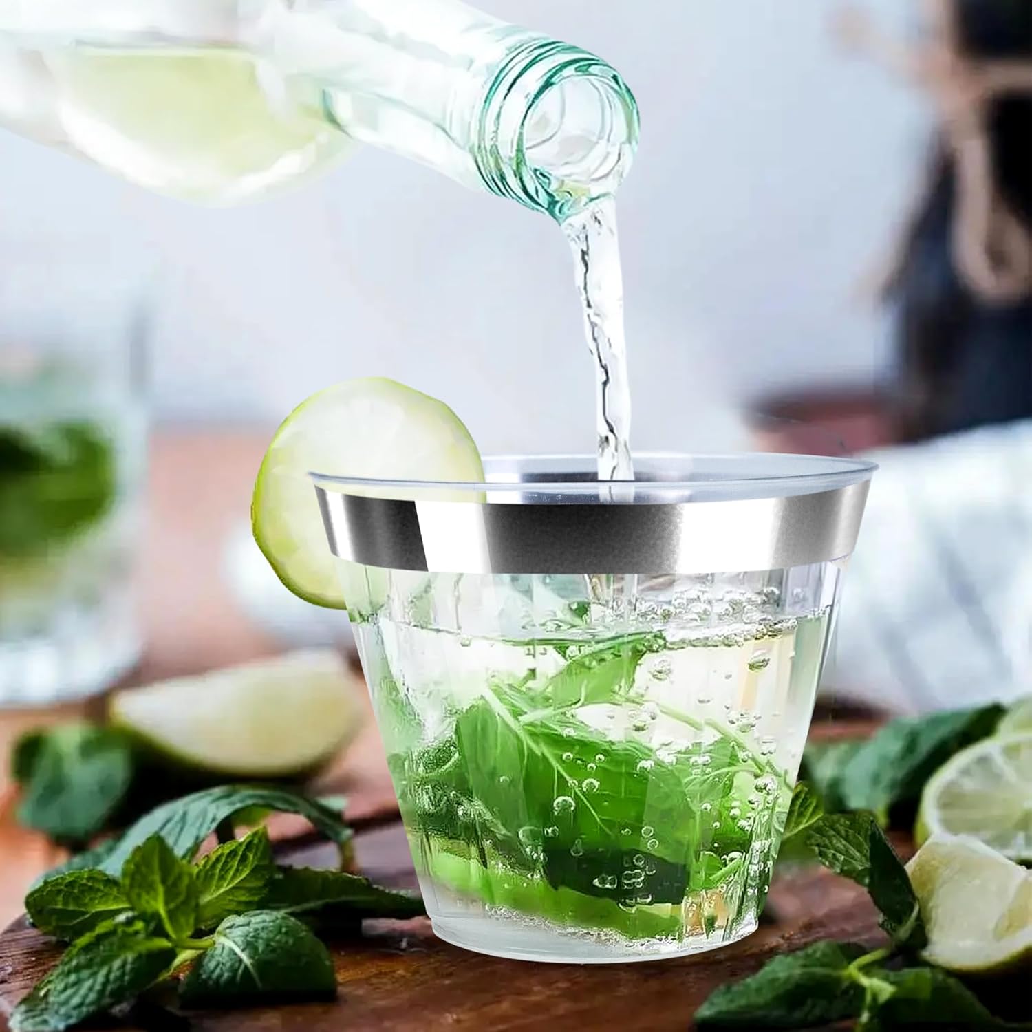 [200 Pack] 9oz Clear Plastic Cups with Silver Rimmed Sturdy & Food Safe Disposable Wine Glasses Party Wedding Disposable Drinking Cups Plastic Cocktail Glasses for Wine, Juice & Cold Beverages