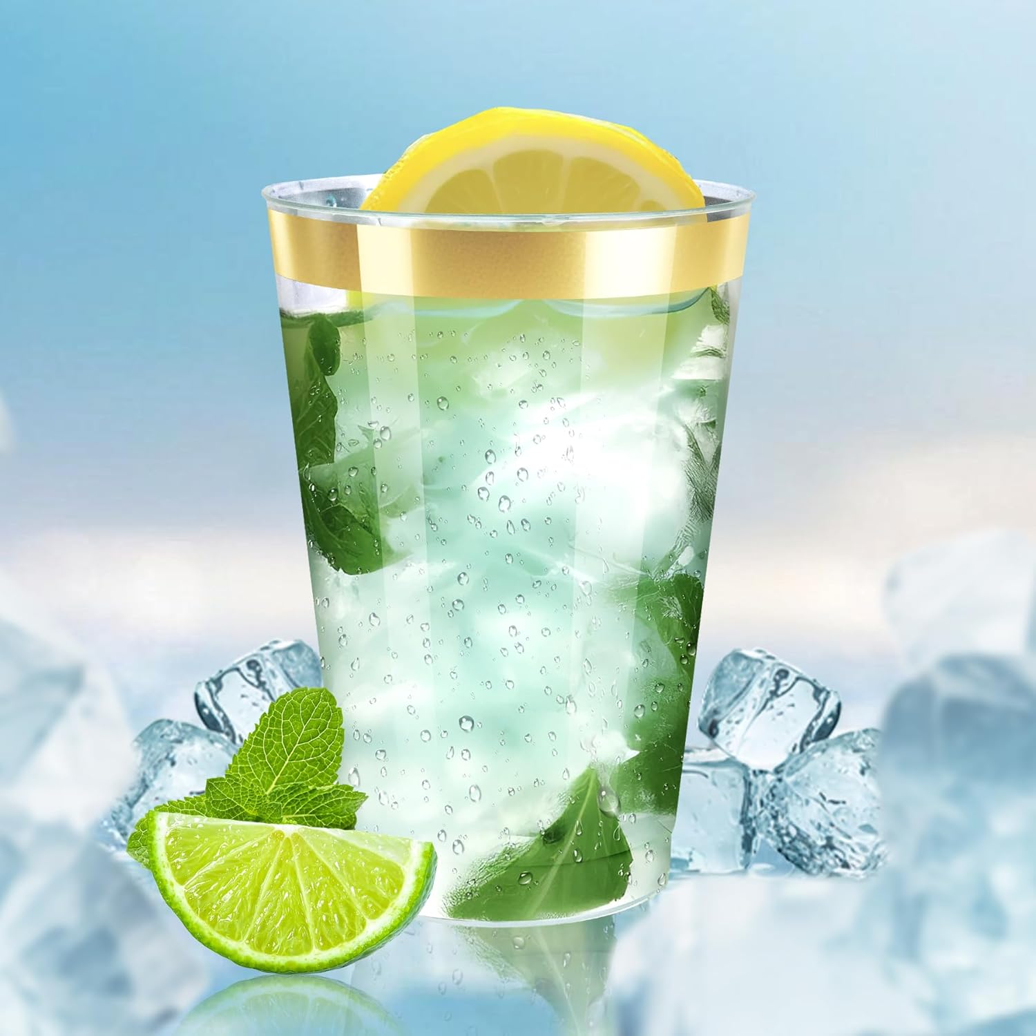 12OZ Plastic Cups with Gold Rimmed Sturdy & Food Safe Disposable Wine Glasses Weeding Party Cups Disposable Drinking Cups Plastic Cocktail Glasses for Wine, Juice & Cold Beverages [200 Pack]