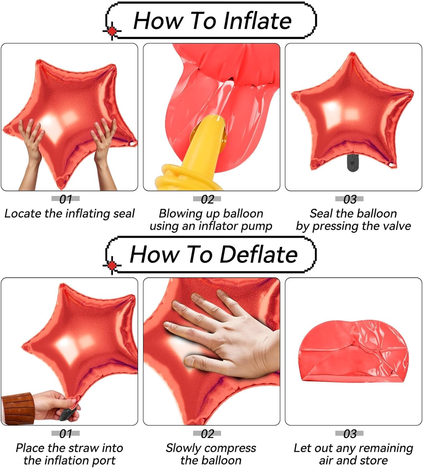 - ăEffortless SetupăInflate with helium or air using a pump and secure easily for polished decor. These Star Foil balloons are simple to assemble and reusable for multiple events, making decorating quick and effortless.