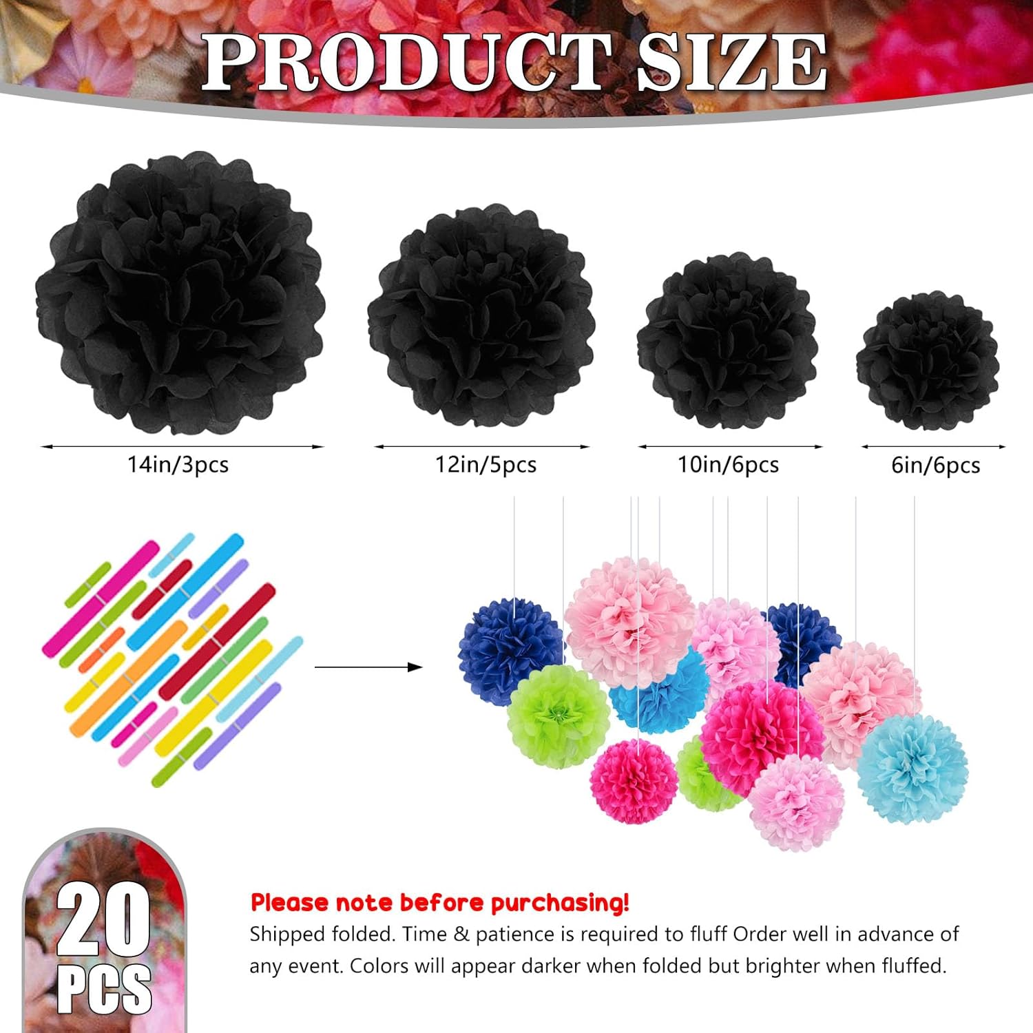 - 【Large Set】20 Pieces black paper flower balls include 6 of 6-inch, 6 of 10-inch, 5 of 12-inch, and 3 of extra-large 14 inch paper pom pom flowers.
